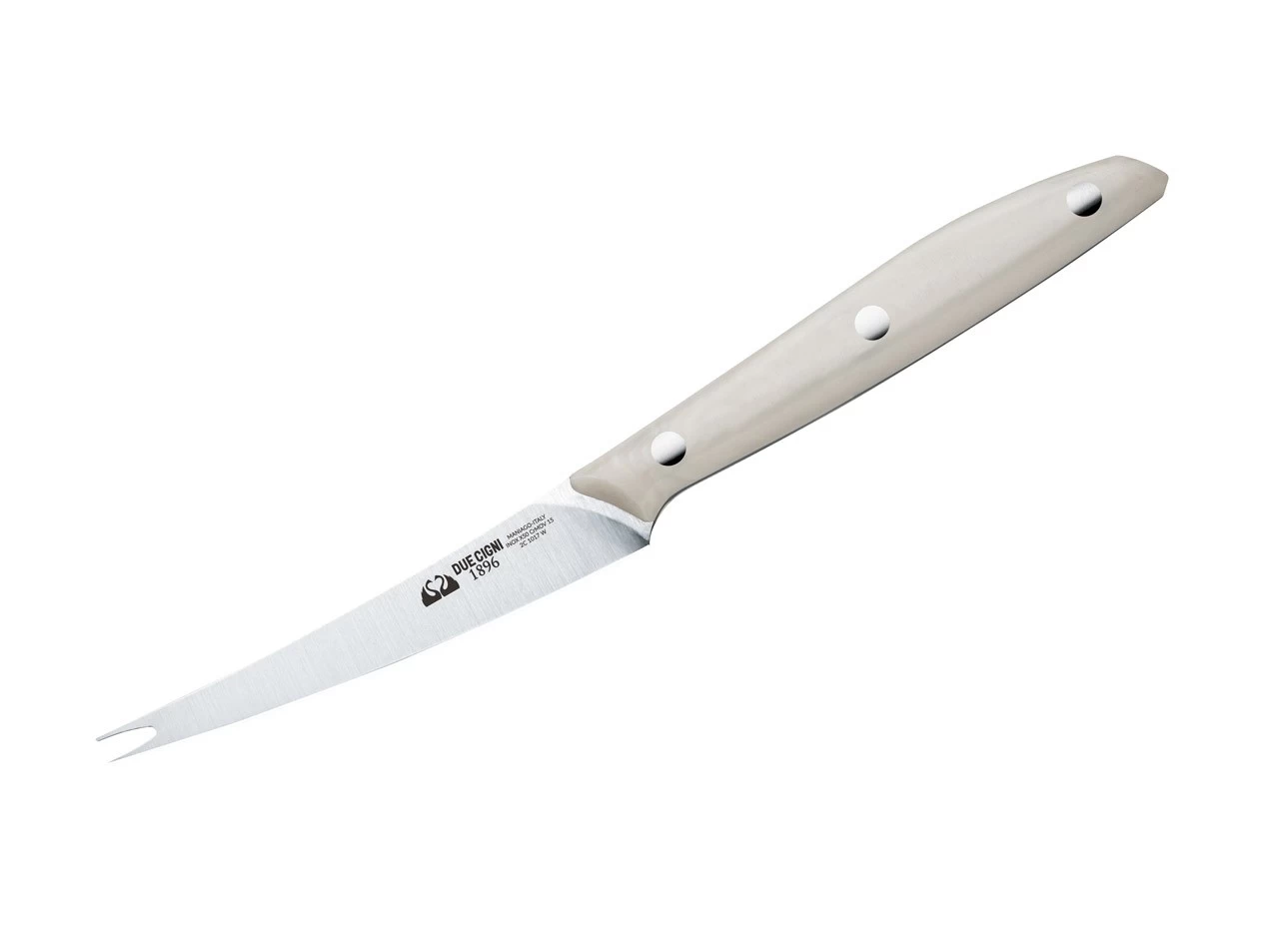 Mit der Serie 1896 stellt Due Cigni eine besonders hochwertige Küchenmesserserie vor, die das Sortiment des Herstellers aus der traditionellen Messerstadt Maniago krönt. Mit Griffen aus widerstandsfähigem weißem POM liegen die Messer ausgezeichnet in der Hand, wobei die klassische Vernietung die optische und haptische Balance perfektioniert. Für die Klinge des klassischen Käsemessers kommt der bewährte X50CrMoV15 zum Einsatz, der Schnitthaltigkeit und Korrosionresistenz perfekt vereint.