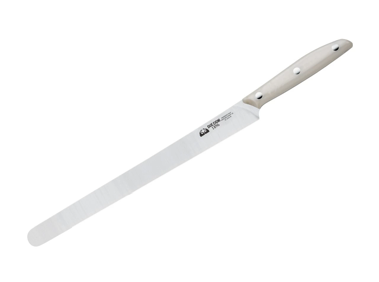 Mit der Serie 1896 stellt Due Cigni eine besonders hochwertige Küchenmesserserie vor, die das Sortiment des Herstellers aus der traditionellen Messerstadt Maniago krönt. Mit Griffen aus widerstandsfähigem weißem POM liegen die Messer ausgezeichnet in der Hand, wobei die klassische Vernietung die optische und haptische Balance perfektioniert. Für die Klinge des Schinkenmessers kommt der bewährte X50CrMoV15 zum Einsatz, der Schnitthaltigkeit und Korrosionresistenz perfekt vereint.