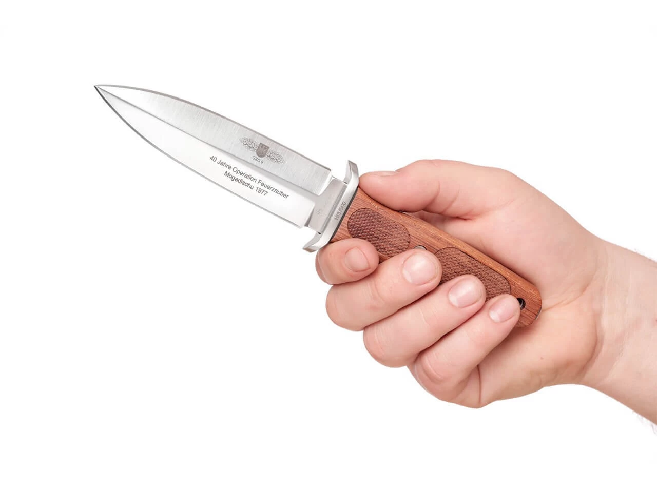 Im Herbst 2017 jährte sich die Befreiung der von Terroristen entführten Lufthansa-Maschine „Landshut“ in Mogadischu zum vierzigsten Mal. Durchgeführt wurde die Befreiungsaktion („Operation Feuerzauber“) von der damals noch recht jungen Einheit GSG 9, die sich, 1972 gegründet, mit diesem erfolgreichen Einsatz unter der Führung des Gründers Ulrich K. Wegener stark im Bewusstsein der Öffentlichkeit verankert hat. Und gerade in Zeiten wie den heutigen, in denen Terror fast schon allgegenwärtig zu sein scheint, kann einer Einheit wie der GSG 9 gar nicht genug Anerkennung und Hochachtung für ihren unermüdlichen Einsatz gegen Terrorismus und Schwerstkriminalität gezollt werden. Wir möchten die Einheit und ihre Mitglieder daher mit zwei Sondermodellen des A-F 4.5 und 5.5 ehren, die wir mit offizieller Genehmigung der GSG 9 auch mit dem Tätigkeitsabzeichen der Einheit, den berühmten Schwingen, versehen dürfen. Kaum ein anderer Messermacher hat das Feld der taktischen Einsatzmesser so sehr geprägt wie William H. “Bill” Harsey, seine Entwürfe haben ihm einen ausgezeichneten Ruf in der Messerwelt eingebracht. Die von ihm entworfene Modifikation des legendären Böker Applegate-Fairbairn verbindet das von vielen Eliteeinheiten im Einsatz genutze Messer mit modernen Elementen. Um der Aktion auch eine Wirkung jenseits des Symbolischen zu verleihen, spendet Böker von jedem verkauften Exemplar 5 Euro an von der GSG 9 benannte wohltätige Organisationen. Ausgestattet sind die Messer mit einer fein satinierten Klinge und Edelstahlknebel, wobei die Schwingen der GSG 9 auf der Klinge verewigt werden. Der Griff wird aus zertifiziert importiertem Palisander gefräst und weist das charakteristische Rillenprofil für maximale Griffigkeit auf. Die Auslieferung erfolgt mit einer hochwertigen schwarzen Lederscheide. Limitiert auf 500 Stück weltweit pro Modell und individuell nummeriert.