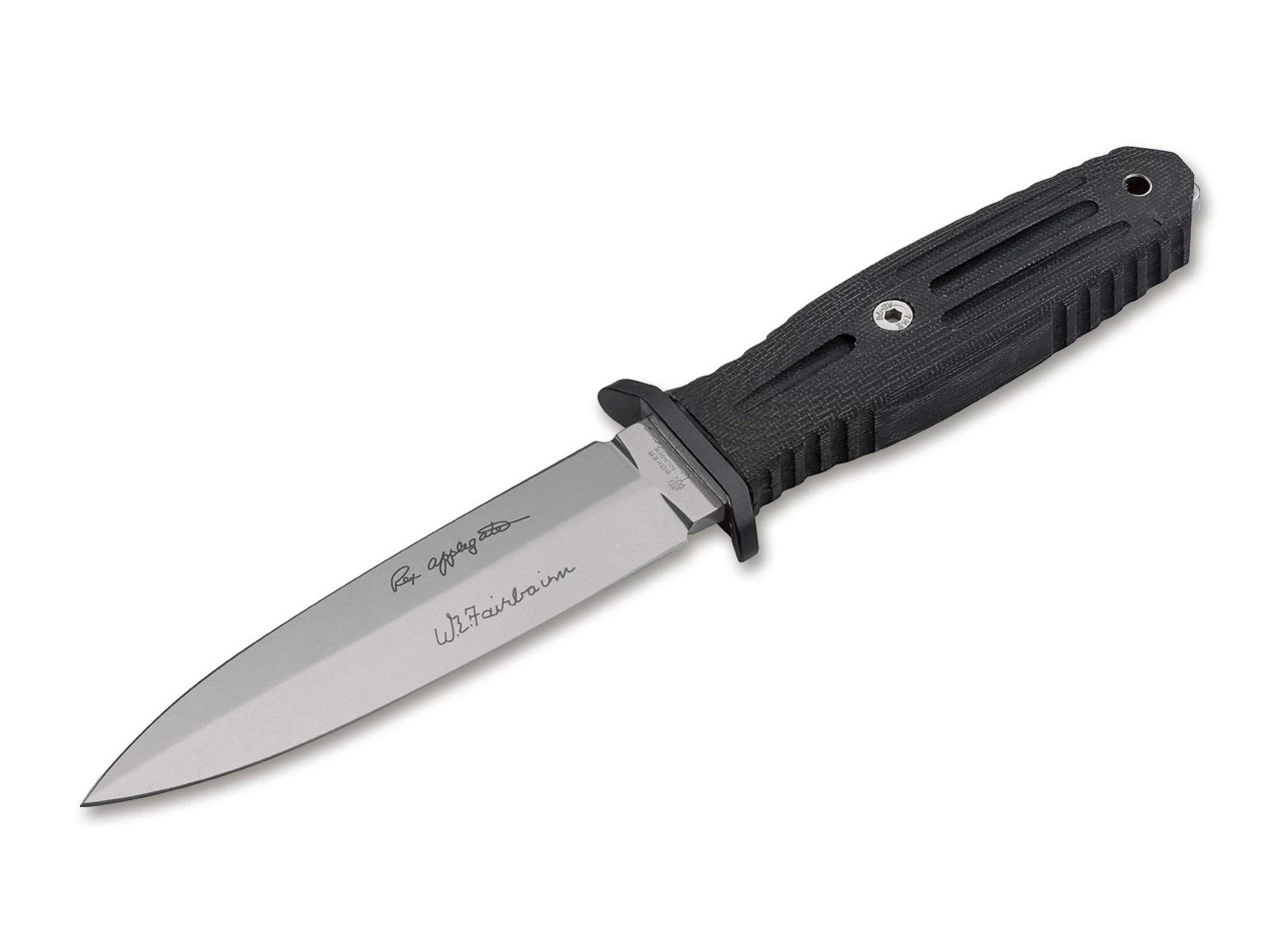 Kaum ein anderer Messermacher hat das Feld der taktischen Einsatzmesser so sehr geprägt wie William H. “Bill” Harsey, seine Entwürfe haben ihm einen ausgezeichneten Ruf in der Messerwelt eingebracht. Die von ihm entworfene Modifikation des legendären Böker Applegate-Fairbairn verbindet das von vielen Eliteeinheiten im Einsatz genutze Messer mit modernen Elementen. Die größere Klingenbreite und die günstigere Geometrie der beidseitig geschliffenen Klinge aus 154CM verbessern die Schneideigenschaften, während die Klingenlänge einen optimalen Kompromiss aus Führigkeit und Nutzwert bietet. Die Klinge ist mit einem robusten Stonewash-Finish versehen. Der am Griffende hervorstehende Klingenerl kann unter anderem als Glasbrecher eingesetzt werden. Die CNC-gefrästen Griffschalen aus schwarzem Canvas-Micarta sind äußerst belastbar, angenehm strukturiert und bieten selbst bei Feuchtigkeit hervorragenden Grip. Lieferung mit schwarzer Lederscheide.