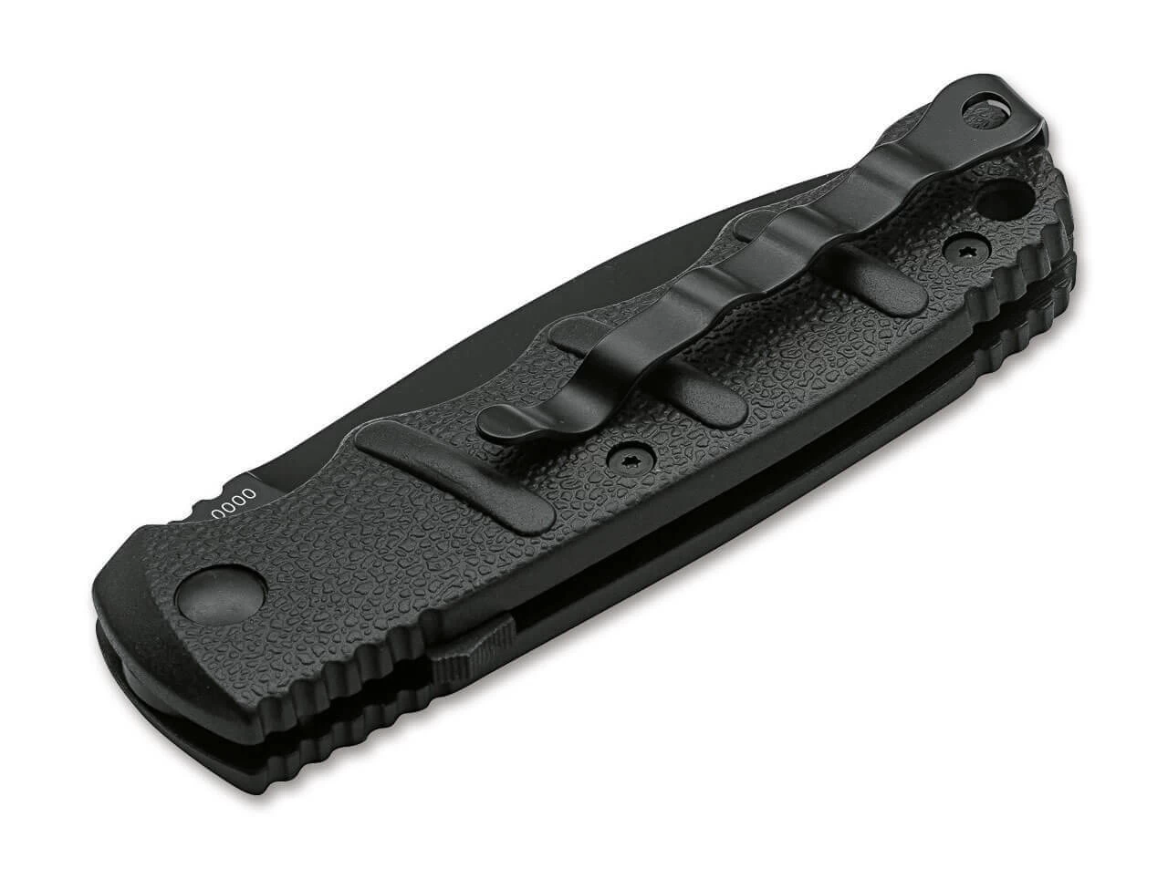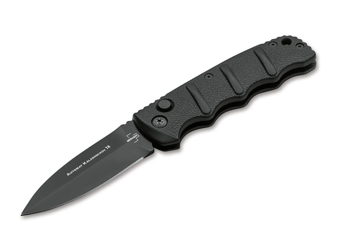 Das Böker Plus AKS-74 aus der Kalashnikov-Serie gehört mit Sicherheit zu den beliebtesten Modellen unseres Sortiments und wurde in den vergangenen Jahren in zahlreichen verschiedenen Varianten produziert. Der schwarze Griff aus Aluminium erinnert stark an das Bajonett des berühmten Sturmgewehrs, die erhabenen Strukturbahnen bieten zudem in jeder Situation sicheren Halt. Die ebenfalls schwarze Spearpoint-Klinge wird aus rostfreiem D2 gefertigt und kann zusätzlich zum Druckknopf per Schiebesicherung gesichert werden. Mit Fangriemenöse und praktischem Clip (Tip-Up/r).