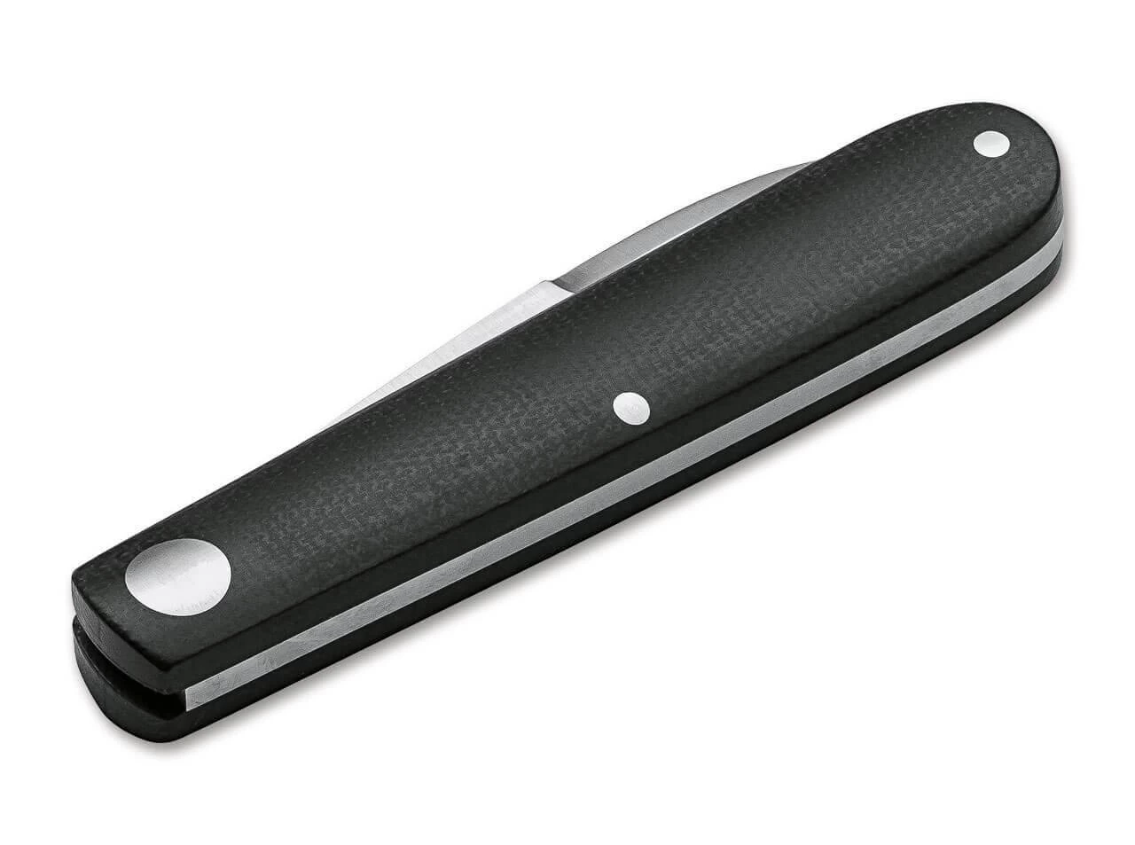 Diese in integralbauweise ausgeführte Version des neu interpretierten Böker Barlow Prime verzichtet auf die charakteristischen Backen und ist stattdessen mit durchgehenden, angenehm konturierten Griffschalen aus schwarzem Canvas Micarta ausgestattet. Die leichtgewichtige Konstruktion kann so komplett auf zusätzliche Liner aus Metall verzichten. Die satinierte Klinge wird aus eisgehärtetem N690 gefertigt und per Nagelhau geöffnet. Sie ist mit einer modernen, langgezogenen Fehlschärfe versehen, die Bediensicherheit des Slipjoints wird durch eine 90 Grad Rastung beim Öffnen und Schließen erhöht. Die dekorativen Nieten bestehen aus Edelstahl. Mit hochwertigem Filz-Etui zur Aufbewahrung. Handgefertigt in der Böker Messer-Manufaktur Solingen.