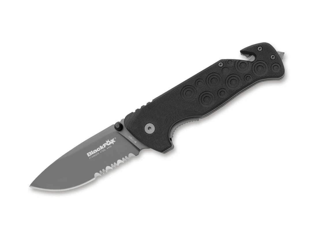 Das BlackFox Black Action ist ein Rettungsmesser der ersten Klasse. Glasbrecher und Gurtschneider, strukturierte G10-Schalen und eine universelle Droppoint-Klinge mit halbem Wellenschliff lassen keine Anforderung unerfüllt. Die Klinge aus rostfreiem 440C verriegelt über einen zuverlässigen Linerlock. Die taktische Variante ist mit Titan-Aluminiumnitrid-beschichteter Klinge und schwarzen G10-Griffschalen ausgestattet.