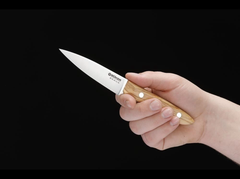 Für diesen anspruchsvollen Entwicklungsauftrag in der eher konservativen Welt der Küchenmesser haben wir den jungen Messerdesigner Thomas Krug gewinnen können. Sein Entwurf präsentiert sich stark funktionsorientiert und trotzdem mit zeitloser Formgebung. Die traditionell gestalteten Klingenformen, gefertigt aus bestem Solinger Chrom-Vanadium- Molybdän Edelstahl (X50CrMoV15), harmonieren wunderbar mit der modernen, ergonomisch optimierten Linienführung der Griffschalen. Per CNC Technik werden die Griffschalen mit äußerster Präzision für eine perfekte Handlage gefertigt. Auffallend ist die speziell entworfene Daumenauflage am Übergang zur Klinge. Hierdurch wird das bei Profiköchen sehr beliebte „Vorne-Greifen“ des Messers zur exakten Führung der Schnitte erheblich erleichtert. Der edle Schimmer der fein gemaserten Olivenholzgriffschalen verleiht den hochwertigen Schneidwerkzeugen eine attraktive Leichtigkeit und gewährleistet eine äußerst angenehme Haptik im Einsatz. Die notwendige Stabilitaät wird durch die Vollerlbauweise garantiert. Nach alter Solinger Tradition werden die Klingen dünn ausgeschliffen und blau gepließtet. Auslieferung mit Echtheitszertifikat.