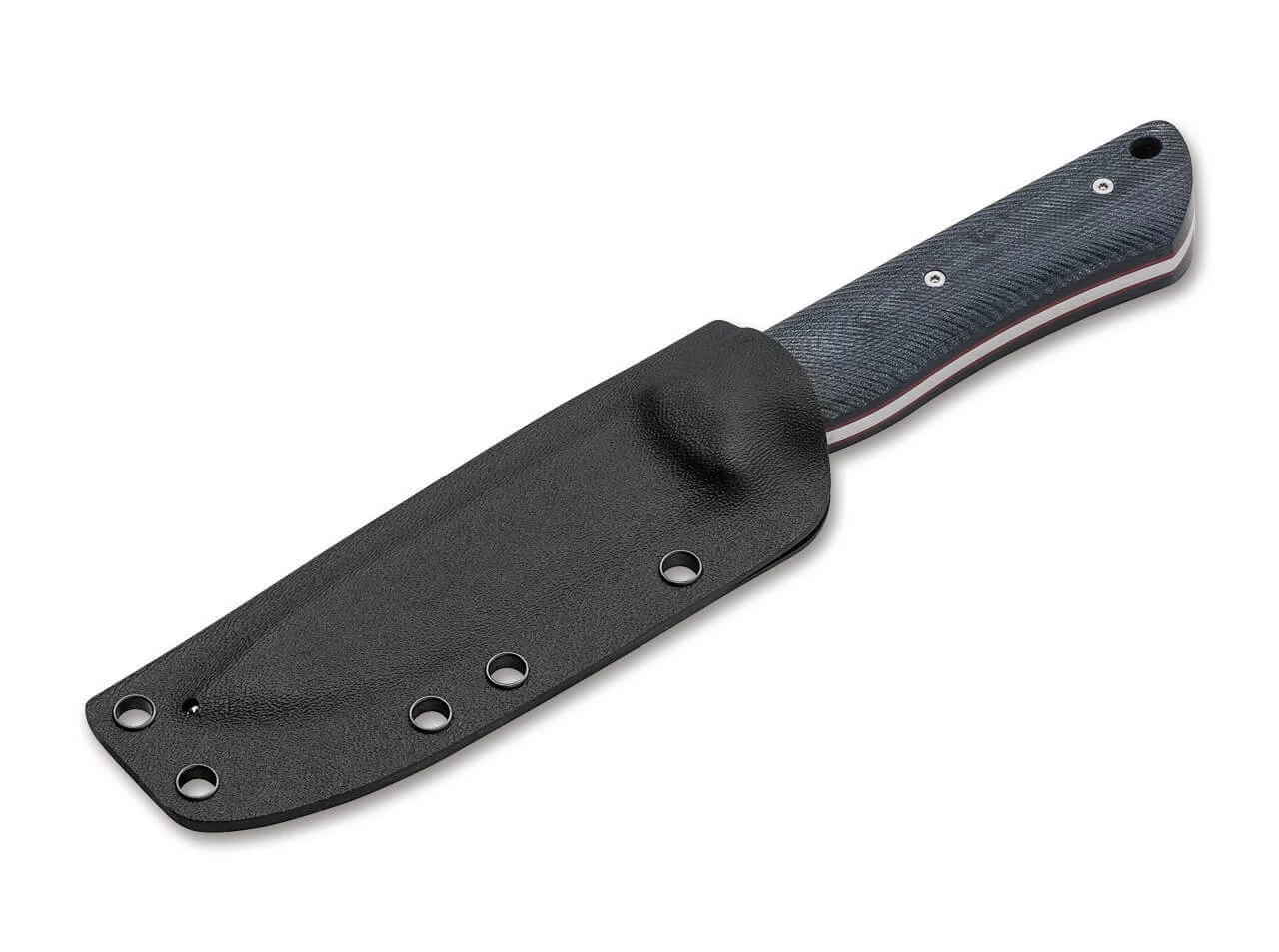 Klassisch konzipiertes Bushcraft-Messer mit typischem Scandi-Grind für eine scharfe, stabile und leicht nachzuschärfende Klinge. Griff aus schwarzem G10 mit Zwischenlage aus rotem G10 und mit extragroßer Fangriemenöse. Kydexscheide mit abnehmbarer Gürtelschlaufe. Klingenstahl D2. Sonderversion mit zusätzlichen Wechselschalen in den Farben Schwarz und Grün.