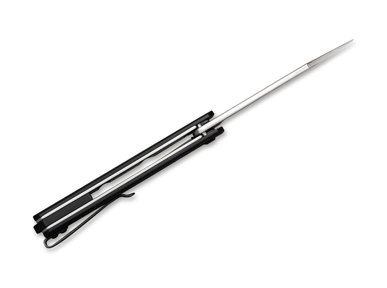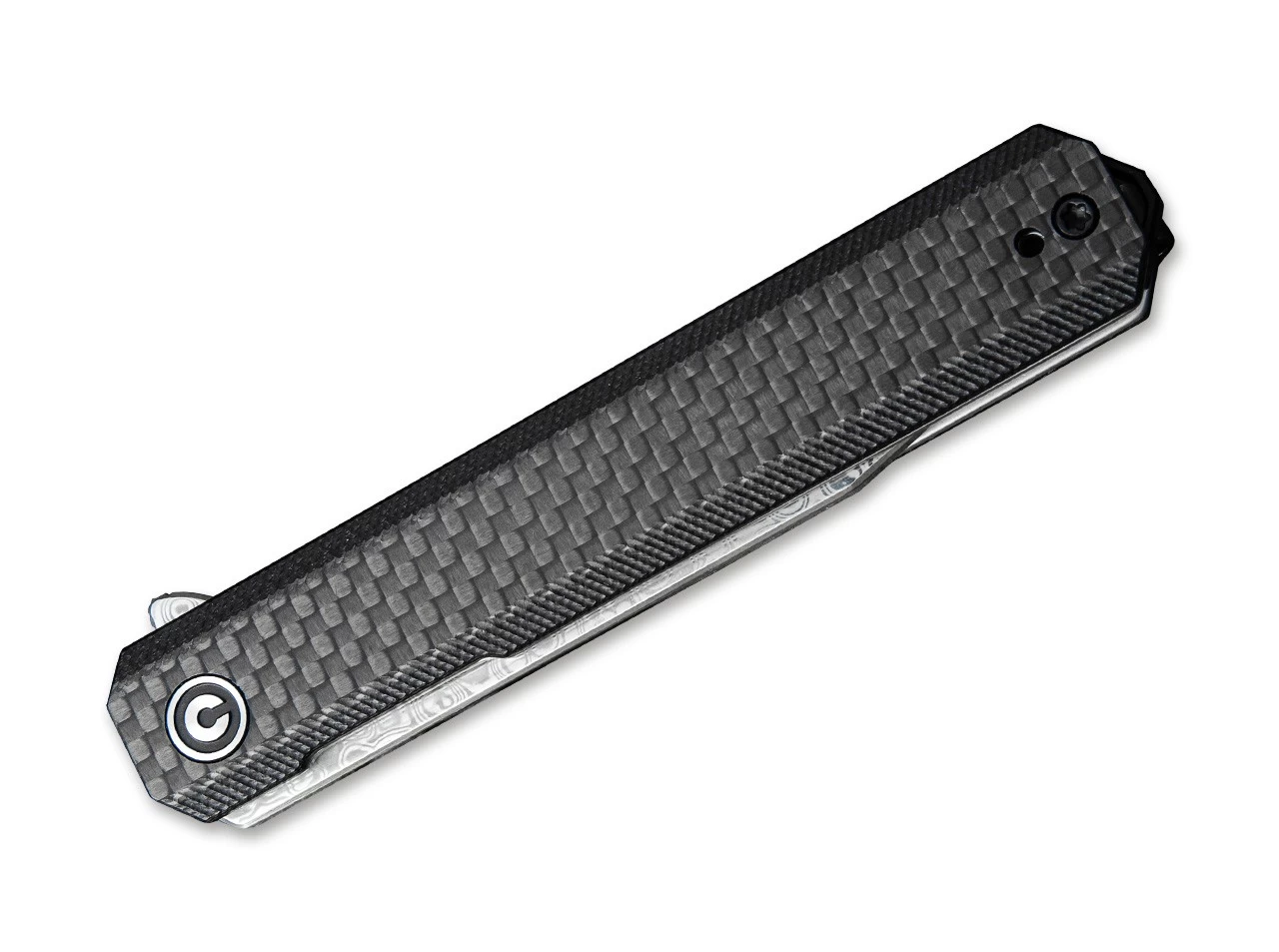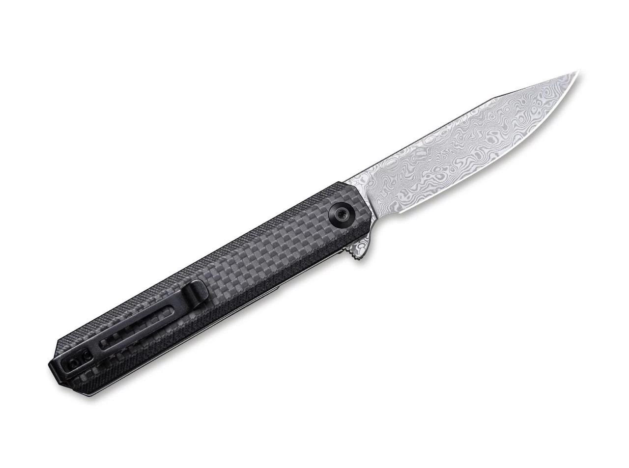 Das CIVIVI Chronic hat ein sehr schlankes Design, mit einer schmalen, hohlgeschliffenen Klinge aus Damast. Die satinierte Clippoint-Klinge wird per Flipper geöffnet und ermöglicht schnelles Arbeiten. Der Edelstahl Linerlock sorgt für sicheres Arretieren der Klinge. Der schlichte Griff aus schwarzem G10 mit einem Kohlefaserüberzug rundet die Optik des Messers ab. Mit Fangriemenöse und abnehmbarem Clip (Tip-up).