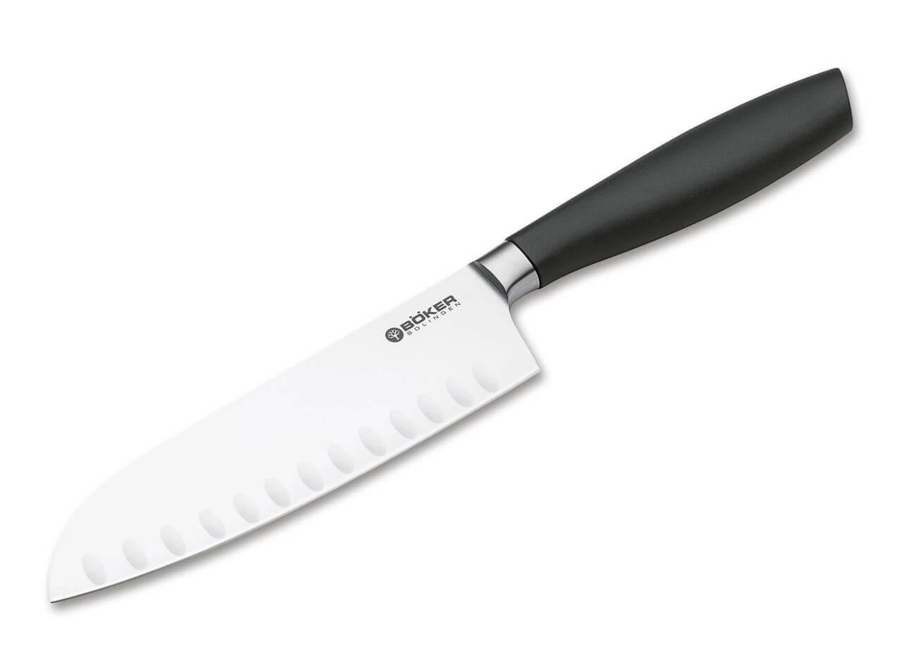 Ein Messer, das sich auch in Europa immer größerer Beliebtheit erfreut, ist das Santoku. Es ist ursprünglich eine japanische Klingenform für ein Allzweckmesser. Übersetzt bedeutet dessen Name “Die drei Tugenden”, es ist für Fleisch, Fisch und Gemüse gleichermaßen gut geeignet. Dank der breiten Klinge lässt sich das Santoku besonders einfach handhaben.