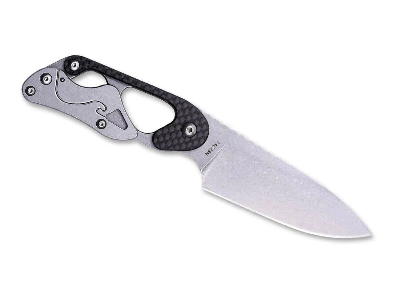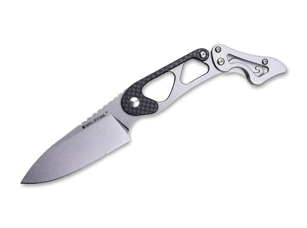 Das weiterentwickelte Cormorant Apex von Real Steel ist ein innovatives feststehendes Messer, das aufgrund des variablen Griffs mit einem breiten Einsatzspektrum glänzt. Das kompakte Messer kann problemlos als leichtes EDC oder auch Neck Knife getragen werden, bietet mit ausgeklappter Verlängerung aber die komfortable Handlage eines deutlich größeren Messers. Gefertigt wird die Ganzstahlkonstruktion mit Stonewash-Finish aus 14C28N, der skelettierte Griff mit Schalen aus Kohlefaser reduziert das Gewicht zusätzlich. Mit praktischer Kydex-Scheide.