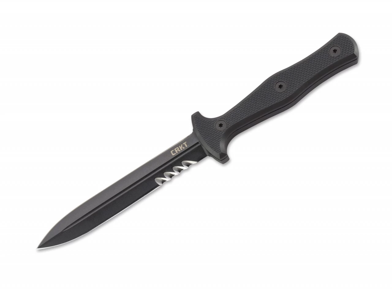 Dieser beidseitig geschliffene Dolch von Darrin Williams besitzt eine Klinge aus SK-5 Kohlenstoffstahl mit schwarzer Pulverbeschichtung und aggressiver Veff-Serration auf einer Seite. Der Griff besteht aus schwarzem, rutschsicheren G10. Die schwarze Nylonscheide mit Durchstichschutz kann mühelos an taktischer Ausrüstung befestigt werden.