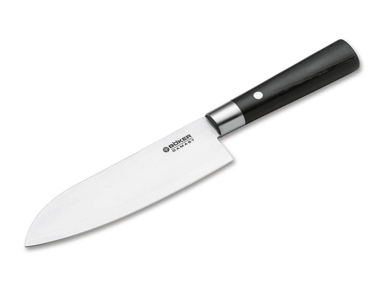 Ein Messer, das sich auch in Europa immer größerer Beliebtheit erfreut, ist das Santoku. Es ist ursprünglich eine japanische Klingenform für ein Allzweckmesser. Übersetzt bedeutet dessen Name “Die drei Tugenden”, es ist für Fleisch, Fisch und Gemüse gleichermaßen gut geeignet. Dank der breiten Klinge lässt sich das Santoku besonders einfach handhaben.
