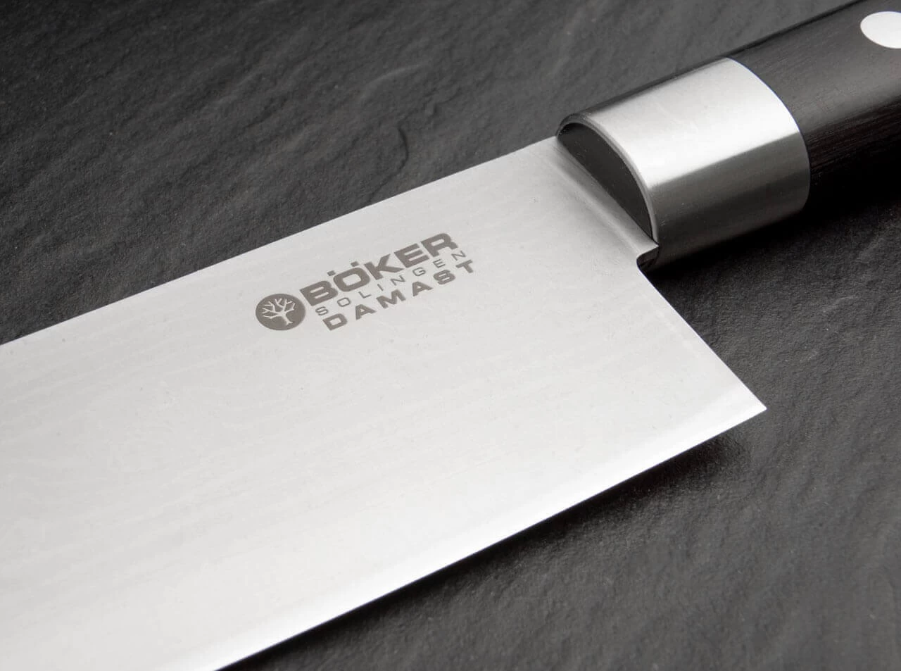 Das Geheimnis der ungewöhnlichen Schärfe liegt im Material und dessen Bearbeitung. Die Klinge besteht aus 37 Lagen Damaststahl. Der rostträge Premium-Klingenstahl VG-10 der mittleren Schneidlage wird in Japan hergestellt und zeichnet sich durch einen hohen Härtegrad, Zähigkeit und eine homogene kristalline Struktur aus. Im direkten Vergleich der Schneidleistung mit einem Produkt eines etablierten Solinger Küchenmesserherstellers gemäß der DIN EN ISO 8442-5 schneiden die Messer nicht nur sprichwörtlich besser ab. Die Schneidleistung liegt im repräsentativen DIN-Test mehr als 68 % über der des Wettbewerbsproduktes. Zusätzlich überzeugen die Serie Böker Damast Black durch eine höhere Anfangsschärfe. Ständiges Nachschärfen gehört damit der Vergangenheit an.
