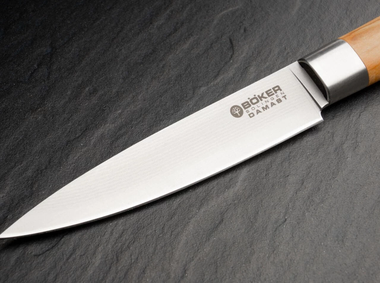 Das Geheimnis der ungewöhnlichen Schärfe liegt im Material und dessen Bearbeitung. Die Klinge besteht aus 37 Lagen Damaststahl. Der rostträge Premium-Klingenstahl VG-10 der mittleren Schneidlage wird in Japan hergestellt und zeichnet sich durch einen hohen Härtegrad, Zähigkeit und eine homogene kristalline Struktur aus. Im direkten Vergleich der Schneidleistung mit einem Produkt eines etablierten Solinger Küchenmesserherstellers gemäß der DIN EN ISO 8442-5 schneiden die Messer nicht nur sprichwörtlich besser ab. Die Schneidleistung liegt im repräsentativen DIN-Test mehr als 68 % über der des Wettbewerbsproduktes. Zusätzlich überzeugen die Serie Böker Damast Olive durch eine höhere Anfangsschärfe. Ständiges Nachschärfen gehört damit der Vergangenheit an.