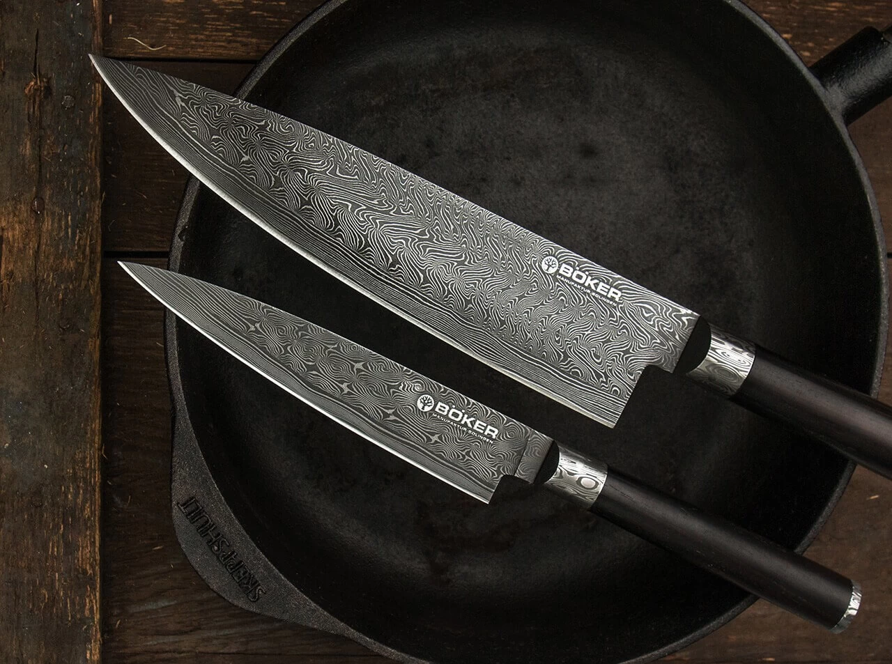 Für das Böker Damast Superior kommt erstmalig ein vierbahniger Torsionsdamast (300 Lagen) mit einer separat geschmiedeten Damast-Schneidleiste zum Einsatz, den der deutsche Damastschmied Andreas Henrichs mit faszinierender Präzision exklusiv für Böker schmiedet. In einem extrem aufwändigen Verfahren werden einzelne Damaststahl-Lagen von Hand zu einem massiven Vierkantstab verschmiedet. Dieser Vierkant wird fünfzehnmal in sich verdreht, wodurch das einzigartige Muster des Torsionsdamasts entsteht. Vier dieser Stränge sowie ein fünfter aus nicht tordiertem Lagendamast werden danach feuerverschweißt und verschmiedet. Das Ergebnis ist ein Klingenrohling von außergewöhnlicher Struktur, ungeahnter Festigkeit und überragender Schneidleistung. In der Böker Messer-Manufaktur in Solingen wird aus dem Klingenrohling in über 150 Arbeitsschritten von Hand das komplette Messer gefertigt.