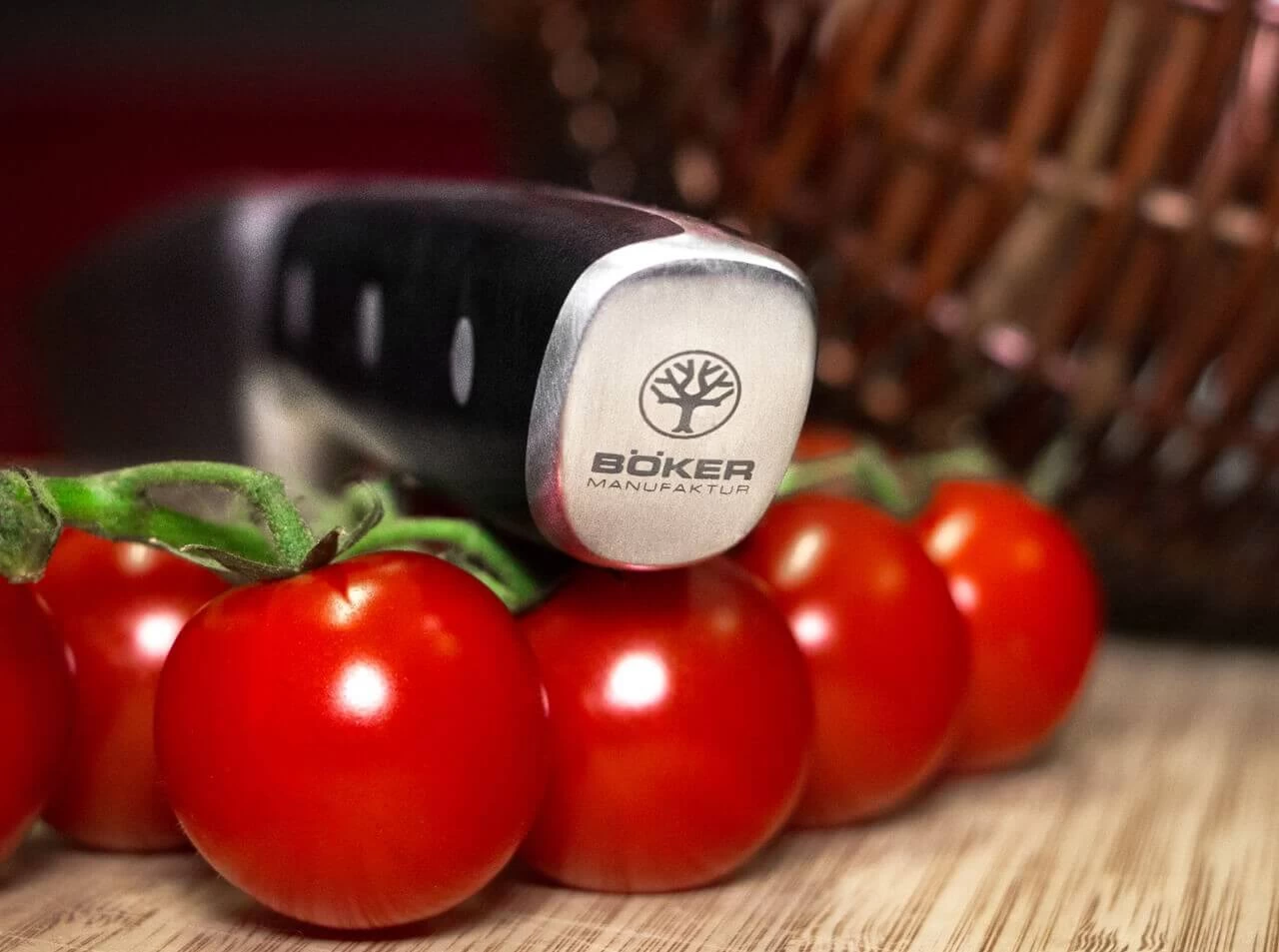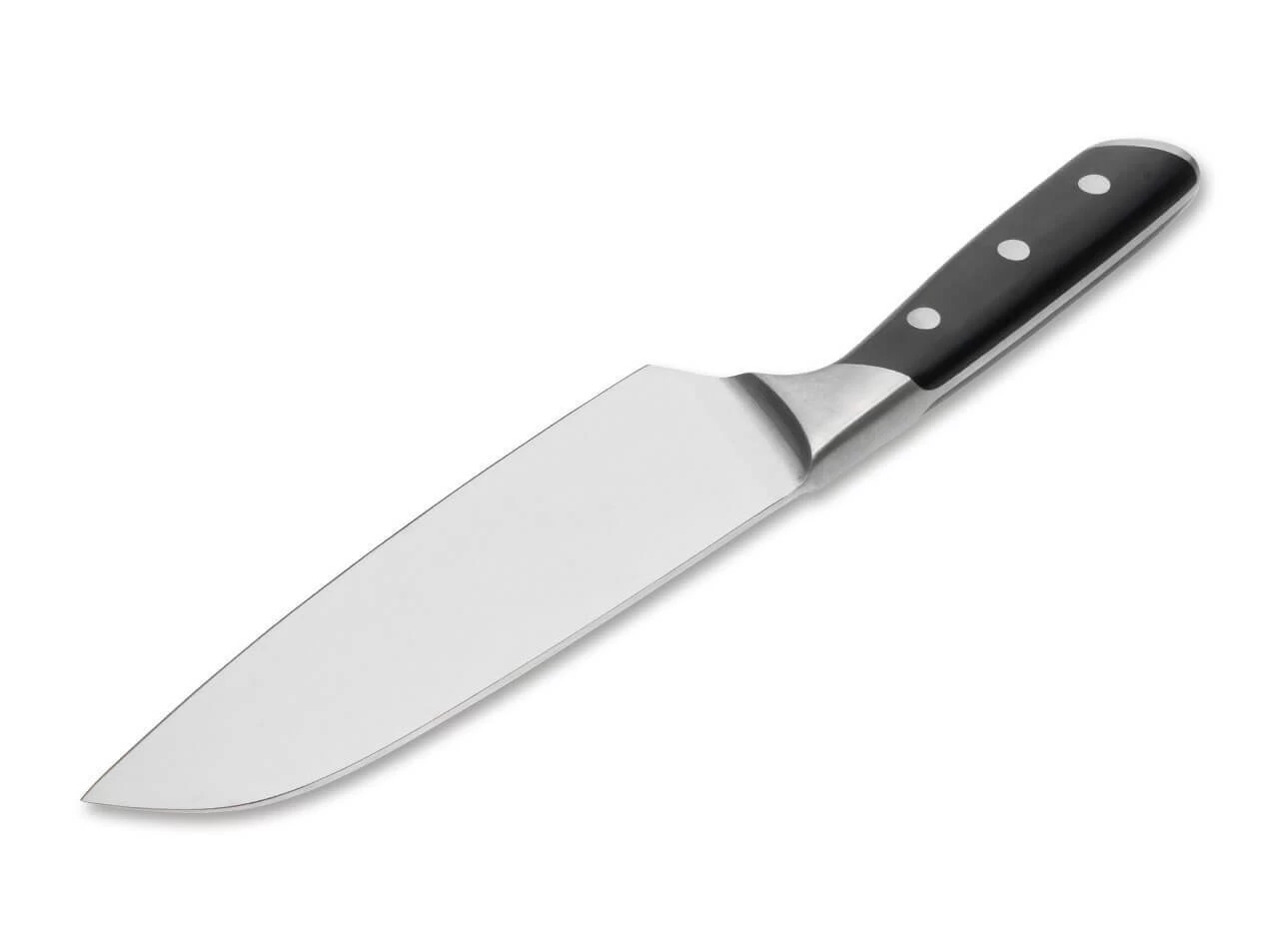 Die Kochmesser-Serie Böker Forge verbindet innovative und dynamische Formgebung mit klassischer Materialauswahl in Premiumqualität. Auffallend ist die attraktive Linienführung, die die Messer deutlich von der Masse der herkömmlichen Küchenmesser abhebt, ohne zu exzentrisch zu wirken. Darüber hinaus überzeugt die Serie Böker Forge mit einem ausgesprochen attraktiven Preis-Leistungs-Verhältnis. Die aus dem Chrom–Molybdän-Vanadium Edelstahl X50CrMoV15 gefertigten Messer sind optimal ausbalanciert und liegen durch die ergonomische Griffgestaltung perfekt in der Hand. Schwarze Griffschalen aus hochwertigem Spezialkunststoff werden klassisch mit drei Edelstahlnieten dauerhaft und ohne Fugen mit dem vollständig durchgehendem Messererl verbunden. Die Gestaltung der Klingen samt Übergang zum Kropf erlaubt ein problemloses Nachschärfen und gewährleistet in Kombination mit der richtigen Pflege eine langfristig perfekte Funktion der Messer. Bitte reinigen Sie die Messer nur per Handwäsche und nicht in der Spülmaschine. Darüber hinaus überzeugt die Serie Böker Forge mit einem ausgesprochen attraktiven Preis-Leistungs-Verhältnis. Die Auslieferung der Messer erfolgt in einer hochwertigen Geschenkverpackung.