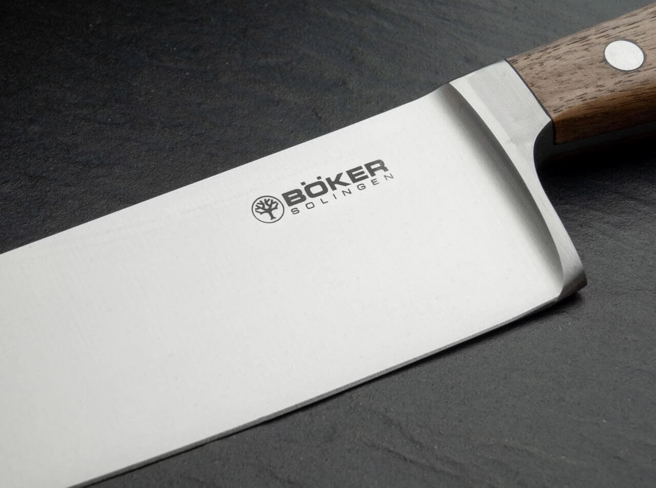 Die geschmiedete Kochmesser-Serie Böker Heritage macht ihrem Namen alle Ehre und tritt das Erbe der traditionellen Solinger Kochmesser an. Das klassische Drei-Nieten-Design wird dafür mit hochwertigen Materialien ausgestattet und führt die perfekte Verarbeitung fort, durch die Solinger Schneidwaren in den letzten Jahrhunderten auf der ganzen Welt bekannt geworden sind. So werden die Klingen der außergewöhnlichen Messer in Vollerl-Bauweise aus X50CrMoV15 gefertigt, der ein ausgewogenes Verhältnis von Schnitthaltigkeit, Rostträgheit und guter Nachschärfbarkeit bietet. Durch die aufwendige Schmiedung in Solinger Handarbeit wird der massive Klingenrohling zusätzlich im Gefüge optimiert, anschließend auf ungefähr 58 HRC gehärtet und zuletzt mit einem feinen Satin-Finish versehen. Die ergonomisch geformten Griffe aus heimischem Walnussholz liegen sehr angenehm in der Hand und vervollständigen das stimmige Gesamtbild. Der geschmiedete Kropf bietet jederzeit einen sicheren Griff, schützt wie der integrierte Knauf vor möglichen Verletzungen und sorgt für eine perfekte Balance.