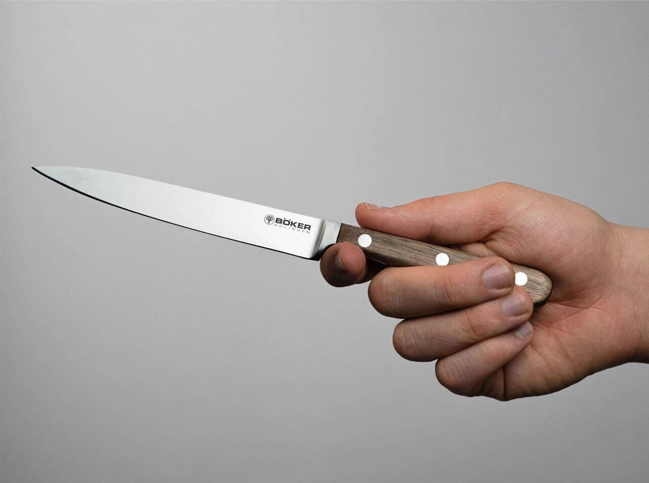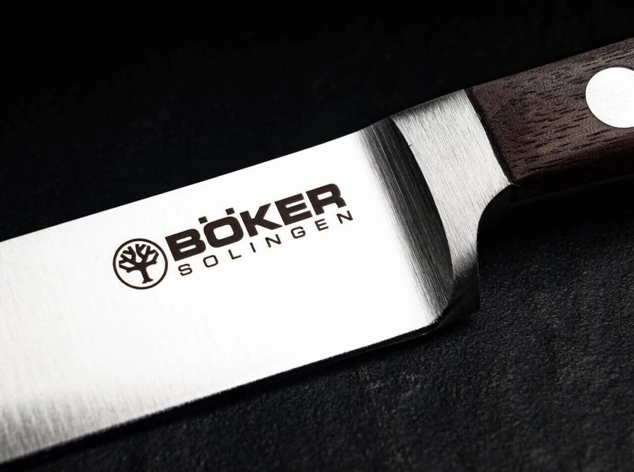 Die geschmiedete Kochmesser-Serie Böker Heritage macht ihrem Namen alle Ehre und tritt das Erbe der traditionellen Solinger Kochmesser an. Das klassische Drei-Nieten-Design wird dafür mit hochwertigen Materialien ausgestattet und führt die perfekte Verarbeitung fort, durch die Solinger Schneidwaren in den letzten Jahrhunderten auf der ganzen Welt bekannt geworden sind. So werden die Klingen der außergewöhnlichen Messer in Vollerl-Bauweise aus X50CrMoV15 gefertigt, der ein ausgewogenes Verhältnis von Schnitthaltigkeit, Rostträgheit und guter Nachschärfbarkeit bietet. Durch die aufwendige Schmiedung in Solinger Handarbeit wird der massive Klingenrohling zusätzlich im Gefüge optimiert, anschließend auf ungefähr 58 HRC gehärtet und zuletzt mit einem feinen Satin-Finish versehen. Die ergonomisch geformten Griffe aus heimischem Walnussholz liegen sehr angenehm in der Hand und vervollständigen das stimmige Gesamtbild. Der geschmiedete Kropf bietet jederzeit einen sicheren Griff, schützt wie der integrierte Knauf vor möglichen Verletzungen und sorgt für eine perfekte Balance.