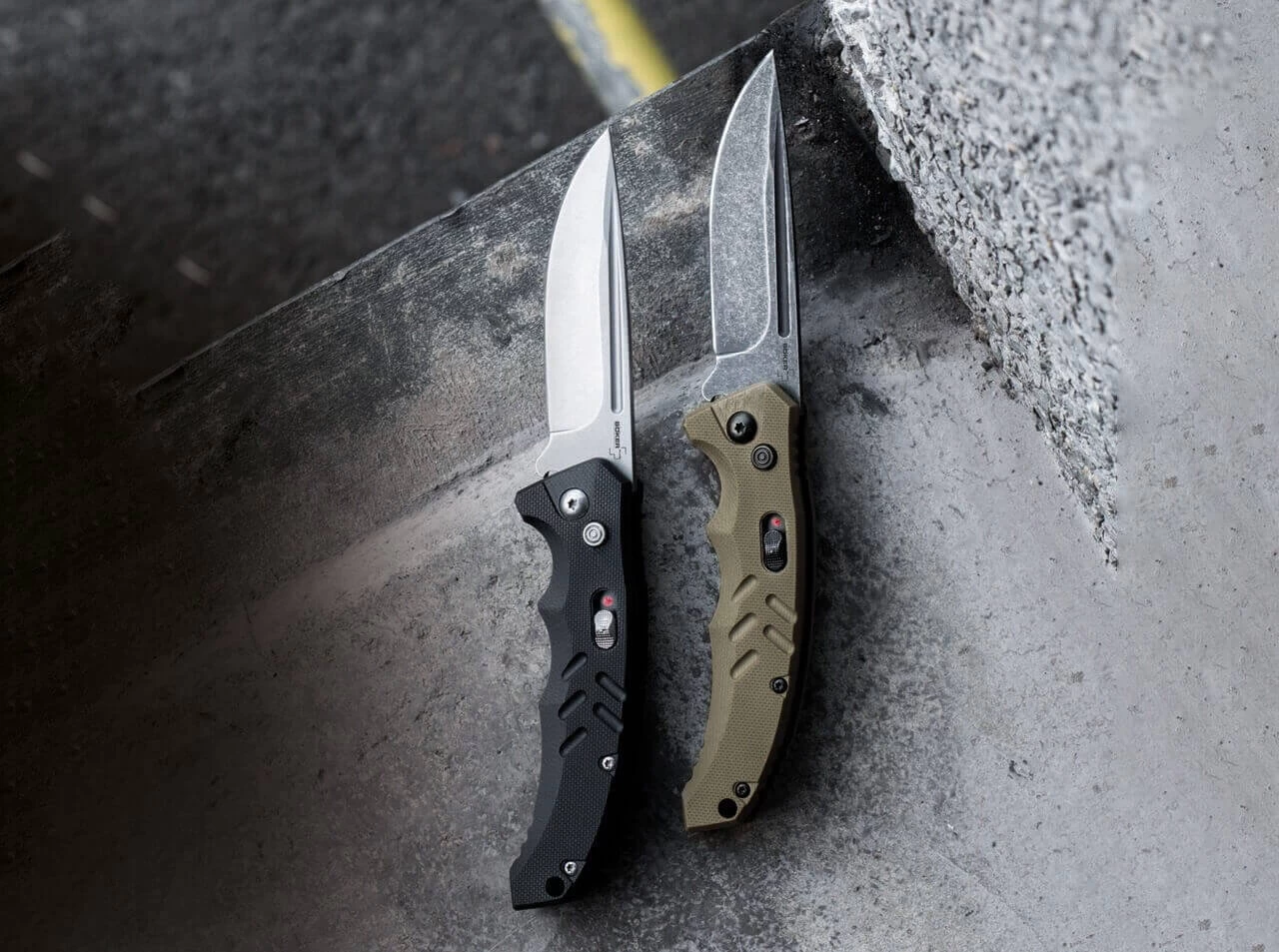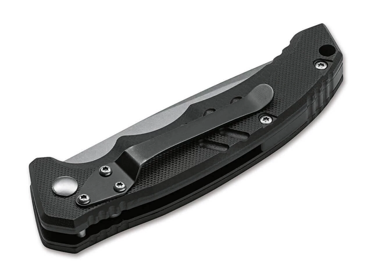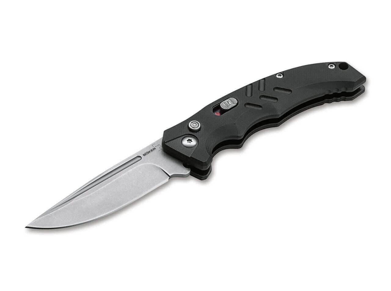 Das als taktisches Automatikmesser konzipierte Böker Plus Intention überzeugt nicht nur im Einsatz, sondern bewältigt auch alle anfallenden Schneidaufgaben des Alltags mühelos. Das Betätigen des Druckknopfes gibt die Stonewash-Klinge aus D2 frei, durch die Spannung der dahinterliegenden Feder klappt sie dann selbstständig auf. Eine sauber rastende Schiebesicherung gegen versehentliches Auslösen sichert das Messer zusätzlich. Der ergonomisch geformte Griff wird aus strukturiertem G10 gefertigt, Riffelungen im Bereich der Daumenauflage und die ausgeprägte Fingermulde verbessern die Handlage nochmals. Mit Fangriemenöse und Clip (Tip-down).