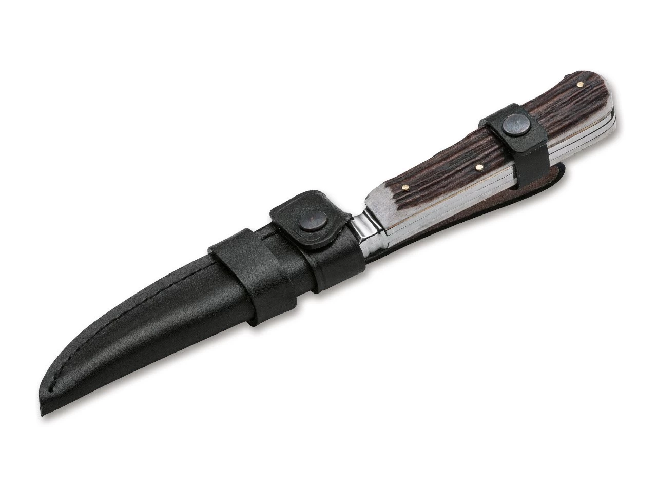 Nach wie vor erfreuen sich klassische feststehende Nicker mit ausklappbaren Zusatzwerkzeugen im Griff großer Beliebtheit. Dieser Hirschhorn-Nicker mit 11 Zentimetern Klingenlänge ist mit einer Säge mit zusätzlichem Kapselheber und Schraubendreher ausgestattet. Lieferung mit klassischer Nickerscheide mit abnehmbarer Gürtelschlaufe. Als Klingenstahl kommt 4109 zum Einsatz.