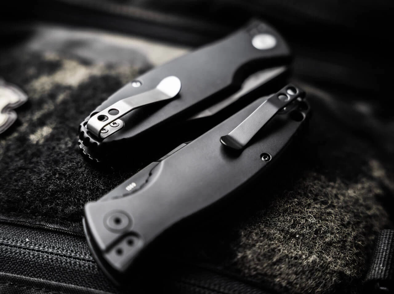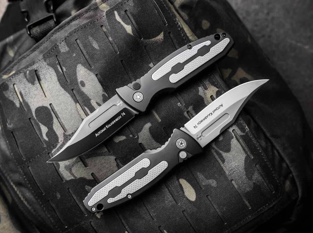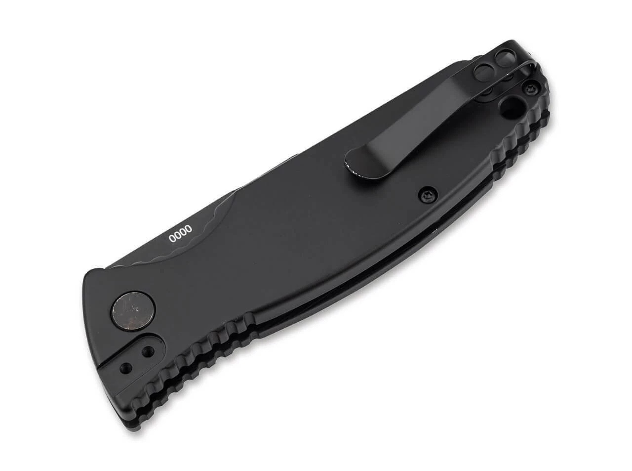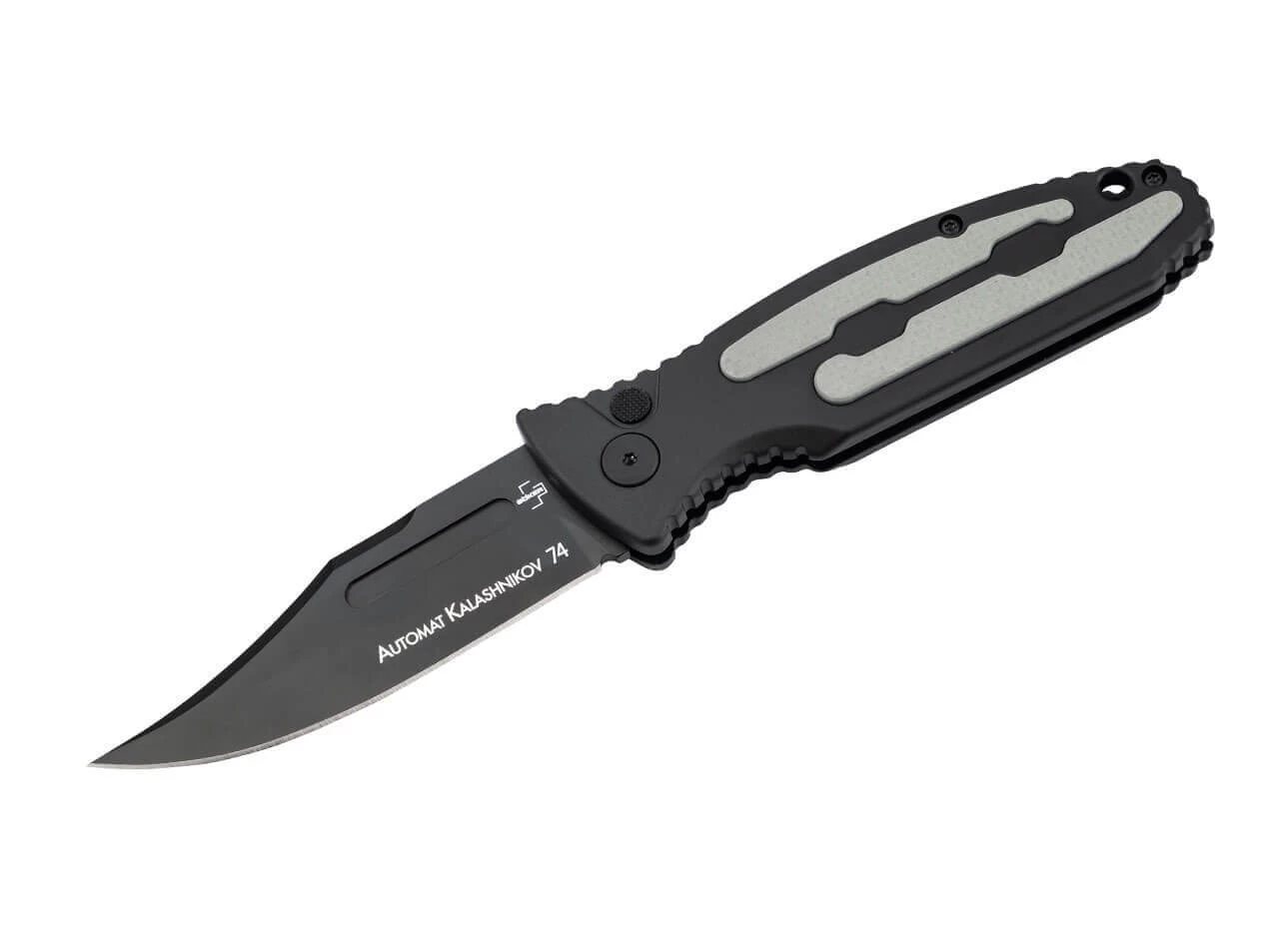 Die Vorgabe bei der Entwicklung des Böker Plus Kalashnikov war es, Designelemente des Sturmgewehrs AK-47 zu integrieren. Als Herstellungsverfahren für den Griff wurde CNC-Fräsen gegenüber der Druckgusstechnik gewählt, um ein Höchstmaß an Präzision zu erzielen. Er wird aus schwarz Hardcoat-anodisiertem 6061-T6 Aluminium gefertigt und ist mit rutschfesten Einlagen aus grauem G10 versehen. Sie weisen dieselbe Kontur auf wie der vordere Handschutz des berühmten Sturmgewehrs. Das auffälligste Wiedererkennungsmerkmal ist die schwarz beschichtete Klinge aus D2, die stilistisch der Bajonettklinge des AK-47 entspricht. Mit Druckknopf, der das Messer sowohl öffnet als auch entriegelt. Mit Clip (Tip-Up).