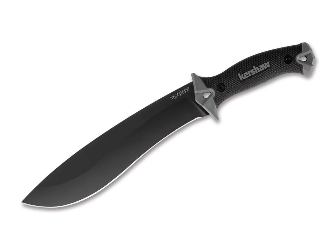 Die vergleichsweise kurze Kershaw Camp 10 Machete ist mit einer Kohlenstoff-Klinge aus 65Mn ausgestattet. Um den Stahl vor Korrosion zu schützten, ist er zusätzlich mit einer schwarzen Oxid-Beschichtung versehen. Der gummierte Griff ist grob texturiert und liegt angenehm in der Hand. Mit Fangriemenöse und praktischer Kunststoffscheide.