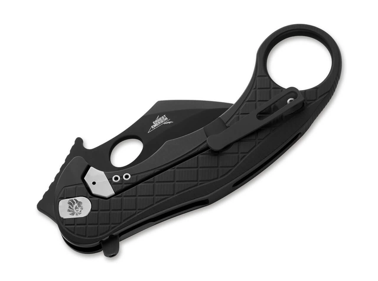 Lionsteel Emerson One, oder kurz L.E. One lautet die Bezeichnung für den majestätischen Karambit-Folder aus dem Hause lionSTEEL, der unter tatkräftiger Mitwirkung von Designer Ernest Emerson entwickelt wurde. Nicht zuletzt ist es die erhabene Anmutung des Leone (dt. Löwe), die dem Framelock-Folder seine einzigartige Anmutung verleiht. Tägliche Schneidarbeiten gelten als leichte Beute für den sichelartigen Fang aus pulvermetallurgischem MagnaCut Stahl im Black-Finish, der dank seines Rudels aus demontierbarem Flipper, Daumenöffnung oder der mähnenähnlichen Wave Öffnung über vielseitige Jagdstrategien verfügt. Der schwarze Aluminiumgriff ist aus einem Stück gefräst und weist den typischen Ring am Griffende auf. Mit Clip (Tip-up/r).