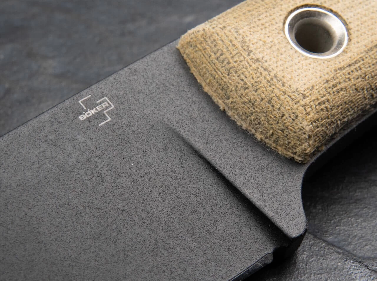 Die stabile Droppoint-Klinge aus SK-85 ist mit einer abriebfesten schwarzen Pulverbeschichtung versehen und in Vollerl-Bauweise ausgeführt, sodass sie auch größeren Beanspruchungen problemlos standhält. Der konturierte Griff aus braunem Micarta liegt dank der feinen Texturierung stets sicher in der Hand und ermöglicht eine Vielzahl sicherer und komfortabler Griffhaltungen. Schnelle Griffwechsel in den Reverse-Grip oder zurück werden durch die ergonomische Form des Griffs unterstützt. Die charakteristischen Hohlnieten dienen zusätzlich als Fangriemenöse. Mit passgenauer Kydexscheide und praktischem Gürteladapter.