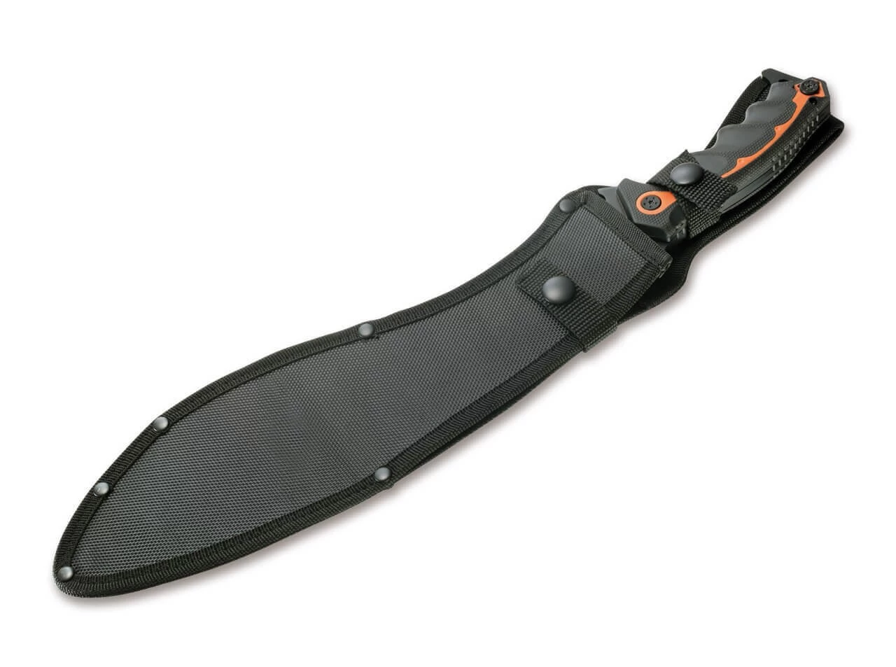 Die Magnum Chainsaw Backup Machete würde ihren Besitzer auch im tropischen Regenwald nicht hängen lassen. Die massive Flachangelkonstruktion mit vierfach verschraubten gummierten Griffschalen sorgt jedoch für eine Übererfüllung der erforderten Stabilitätsreserven. Damit wird die Chainsaw Backup zum ernstzunehmenden Forstwerkzeug zum Entasten und zur Jungwuchspflege. Die optimale Ausgewogenheit von Klingenstärke- und länge sowie die ergonomische Griffgestaltung ermöglichen ermüdungsfreies Arbeiten. Die Griffnase ist gleichzeitig als Fangriemenöse ausgestaltet. Als Schocklasterprobter und gleichzeitig schnitthaltiger Stahl wurde der rostfreie 420 gewählt. Eine robuste, verrottungsfrei gefütterte Nylonscheide mit doppelter Druckknopfsicherung schützt sowohl die Machete als auch ihren Träger.