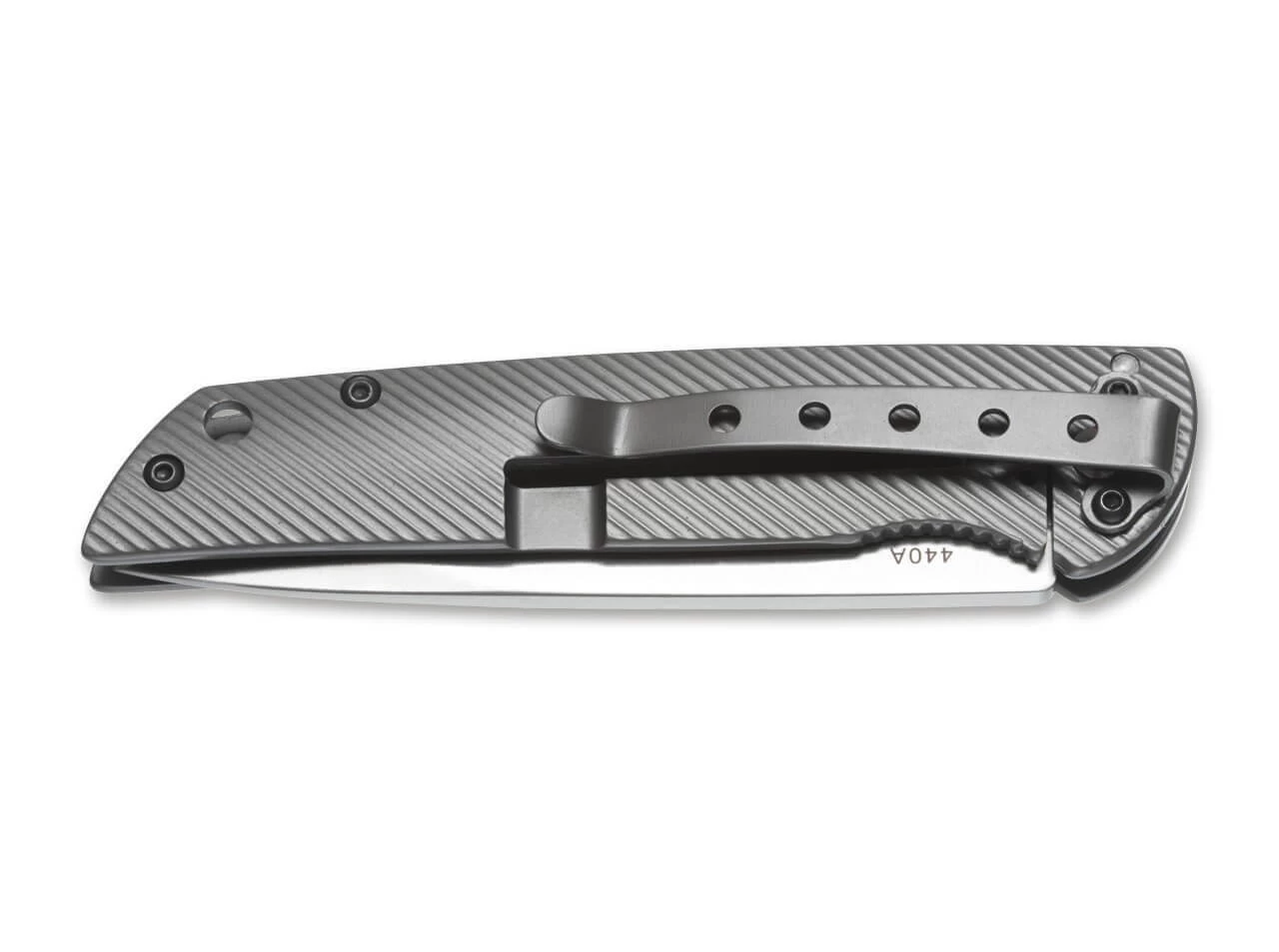 Eine fast rückenspitze Klinge mit ausgeprägter Fehlschärfe, die aus der Ferne an einen Haifisch erinnert, ein Nagelhau und ein schlanker, schlicht strukturierter Griff mit Framelock sind die Ausstattungsmerkmale des Magnum Eternal Classic. Die Klinge des gradlinigen Taschenmessers wird aus 440A–Edelstahl gefertigt. Mit Clip (Tip-down) und Fangriemenöse.