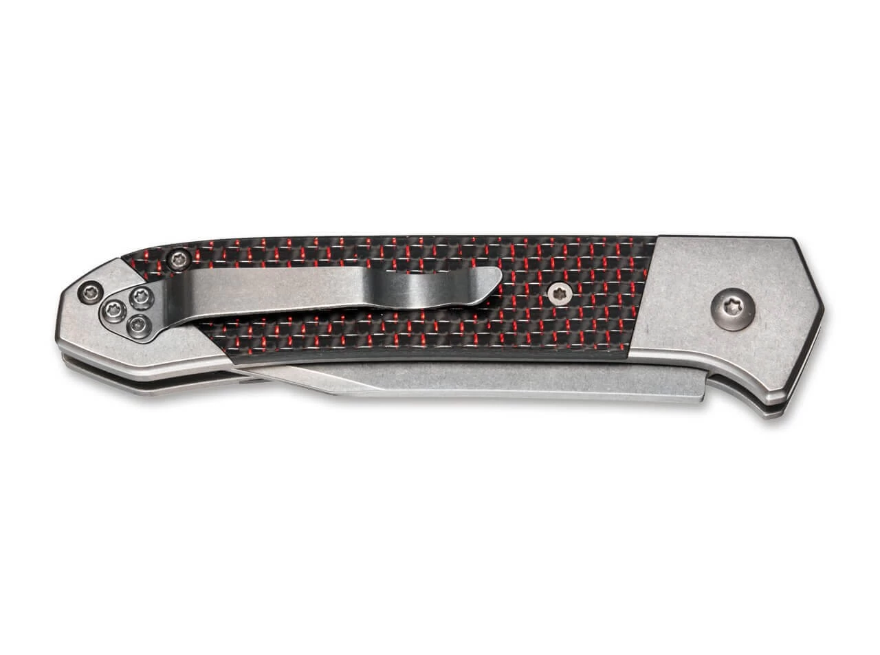 Das moderne Magnum Rubico Auto setzt auf innovative Materialien und einen kräftigen Springmechanismus. Die Klinge aus 440A ist mit einem hellen Stonewash-Finish versehen und öffnet automatisch per Druckknopf. Zum Schließen der Klinge muss der Knopf erneut betätigt werden. Als Griffmaterial kommt rot schimmernde Kohlefaser zum Einsatz, die dem Taschenmesser eine ganz besondere Anmutung verleiht. Mit Clip (Tip-Up).
