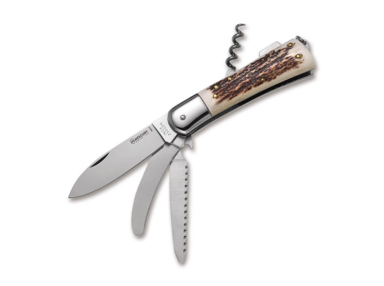 Die robust ausgeführte Hunting-Serie von Mercury ist mit einer drei Millimeter starken Hauptklinge aus Z50CD15 ausgestattet, die per Backlock arretiert und verfügt zusätzlich über eine Säge, eine Aufbruchklinge und einen Korkenzieher. Edelstahlerle und Edelstahlbacken unterstreichen den stabilen Charakter und machen das Hunting 980 zum perfekten Begleiter im Revier. Mit Griffschalen aus klassischem Hirschhorn und Fangriemenöse.