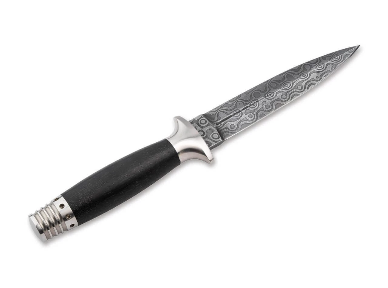 Knebel und Knauf des Dolches sind aus massivem Edelstahl gefertigt. Im Knauf wurden als Design-Element die Kühlrippen und Gasauslässe des Rückstoßverstärkers (eigentlich ein kombiniertes Bauteil mit den Funktionen Rückstoßverstärker, Mündungsfeuerdämpfer und Laufführungshülse) aufgenommen. Dennoch folgte auch hier die Form der Funktion, denn die Rillen erhöhen die Griffigkeit des Dolches im Reversgriff. Knebel und Knauf halten fugenlos die fassförmige Rolle aus Hainbuchenholz, die sich durch Ihre Form automatisch in der Hand zentriert. Der Dolch ist ausgestattet mit einer hochwertigen Scheide aus dunkelbraunem Leder mit Gürtelschlaufe und Ortverstärkung. Auslieferung mit edlem Rahmenetui zur scheinbar schwebenden Präsentation, Echtheitszertifikat und individueller Seriennummer.
