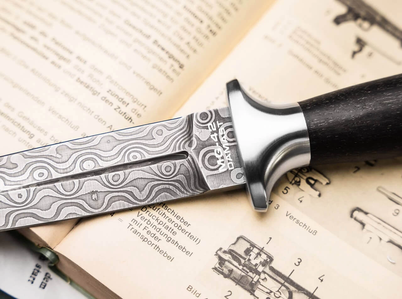 Den Stahl des MG-42 schmiedet unser langjähriger und erfahrener Partner Chad Nicols zum Herzstück des Dolches, der zweischneidig geschliffenen Klinge mit beidseitiger dezenter Hohlkehle. Das gewählte Damast-Muster Low Layer Raindrop (40 Lagen) kommt durch das symmetrische Profil der Klinge hervorragend zur Geltung.