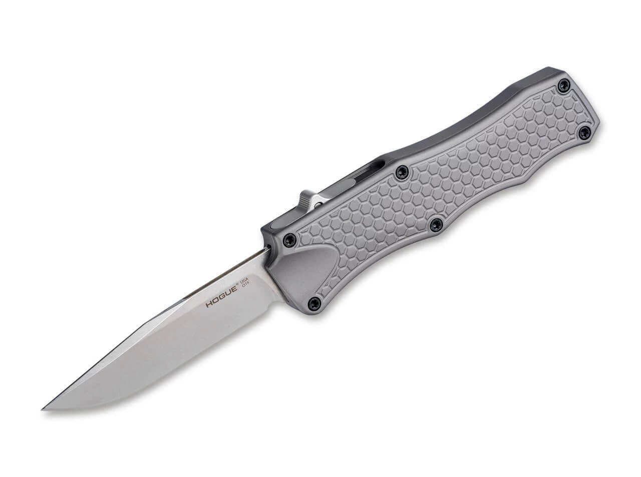 Das Hogue OTF verfügt über eine Tanto-Klinge aus dem pulvermetallurgischen Hochleistungsstahl CPM-154, die sich automatisch aus dem Griff schiebt. Diese hochpräzise Mechanik zeichnet sich durch Belastbarkeit und Zuverlässigkeit aus. Das strukturierte graue Aluminiumgehäuse liegt sicher in der Hand.