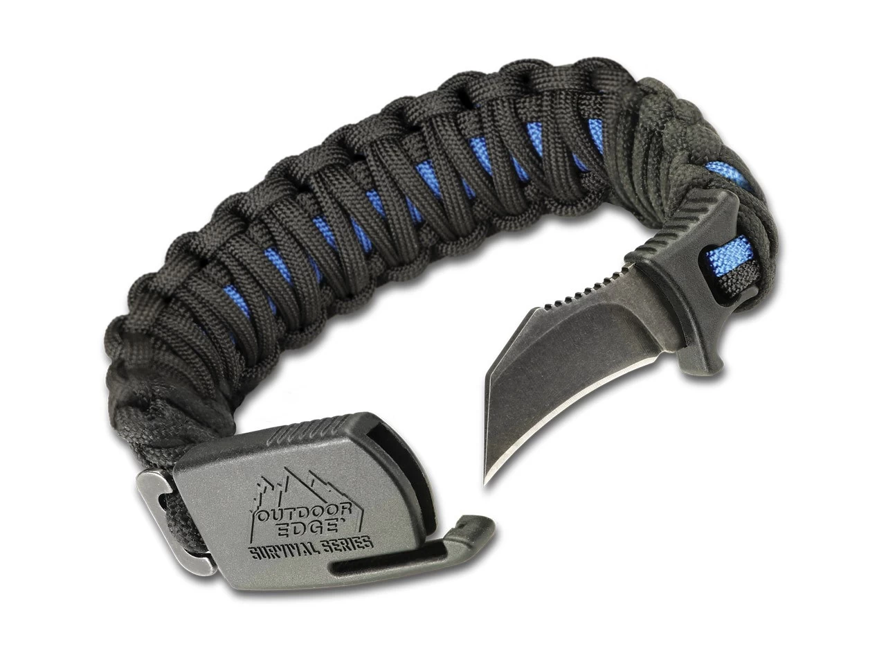 Das ParaClaw von Outdoor Edge verfügt über eine Hawkbill-Klinge aus 8Cr13MoV Edelstahl mit schwarzem Stonewash-Finish. Der patentierte Verschluss sichert die Klinge und hält das Armband aus blau-schwarzem Paracord festgeschlossen, welches im geöffneten Zustand als Messergriff dient. Das Armband ist im Umfang von 16,0-18,0 cm verstellbar und in verschiedenen Größen erhältlich. Inkl. Beutel zur sicheren Aufbewahrung.