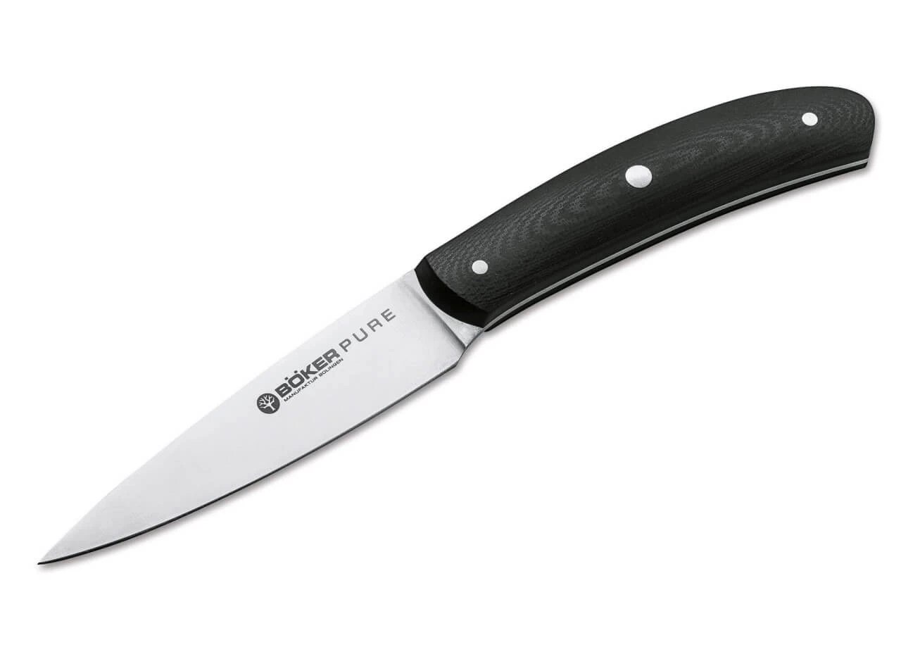 Ein Meilenstein in der Geschichte der Kochmesser von Böker. Vollständig von Hand gefertigt, beeindrucken diese einzigartigen Messerkunstwerke jeden Freund hochwertiger Schneidwerkzeuge aus Solinger Fertigung. Der bekannte Messermacher Jens Ansø aus Dänemark hat im Auftrag von Böker eine puristische und rein funktionsorientierte Messerkonzeption für den anspruchsvollen Anwender entwickelt, die durch eine klare Formensprache und durch eine herausragende Ergonomie überzeugt. Die Messer sind perfekt ausbalanciert, allen anfallenden Schneidarbeiten spielend gewachsen und rasiermesserscharf abgezogen. Die Monostahlvariante aus dem pulvermetallurgischen Hochleistungsstahl CPM-154 zeichnet sich gegenüber konventionellen Stählen durch eine überragende Schnitthaltigkeit aus und nimmt im Bereich der Premium-Küchenmesser eine absolute Spitzenposition ein. Langanhaltende Schärfe ist so auch nach intensiver Beanspruchung garantiert. Das innovative und extrem widerstandsfähige Schalenmaterial G10 bezeichnet einen glasfaserverstärkten Hightech-Kunststoff, der trotz seines geringen Gewichtes hohen Belastungen standhält. Aufgrund seiner hervorragenden Griffigkeit sowohl im trockenen wie auch im feuchten Zustand ist dieses Material aus gezeichnet für die Verwendung in der Küche geeignet. Die Serie Böker Pure setzt Maßstäbe und stellt durch ihren puristischen und funktionsorientierten Ansatz sowie die erstklassige Materialauswahl den Blickfang in Ihrer Küche dar.