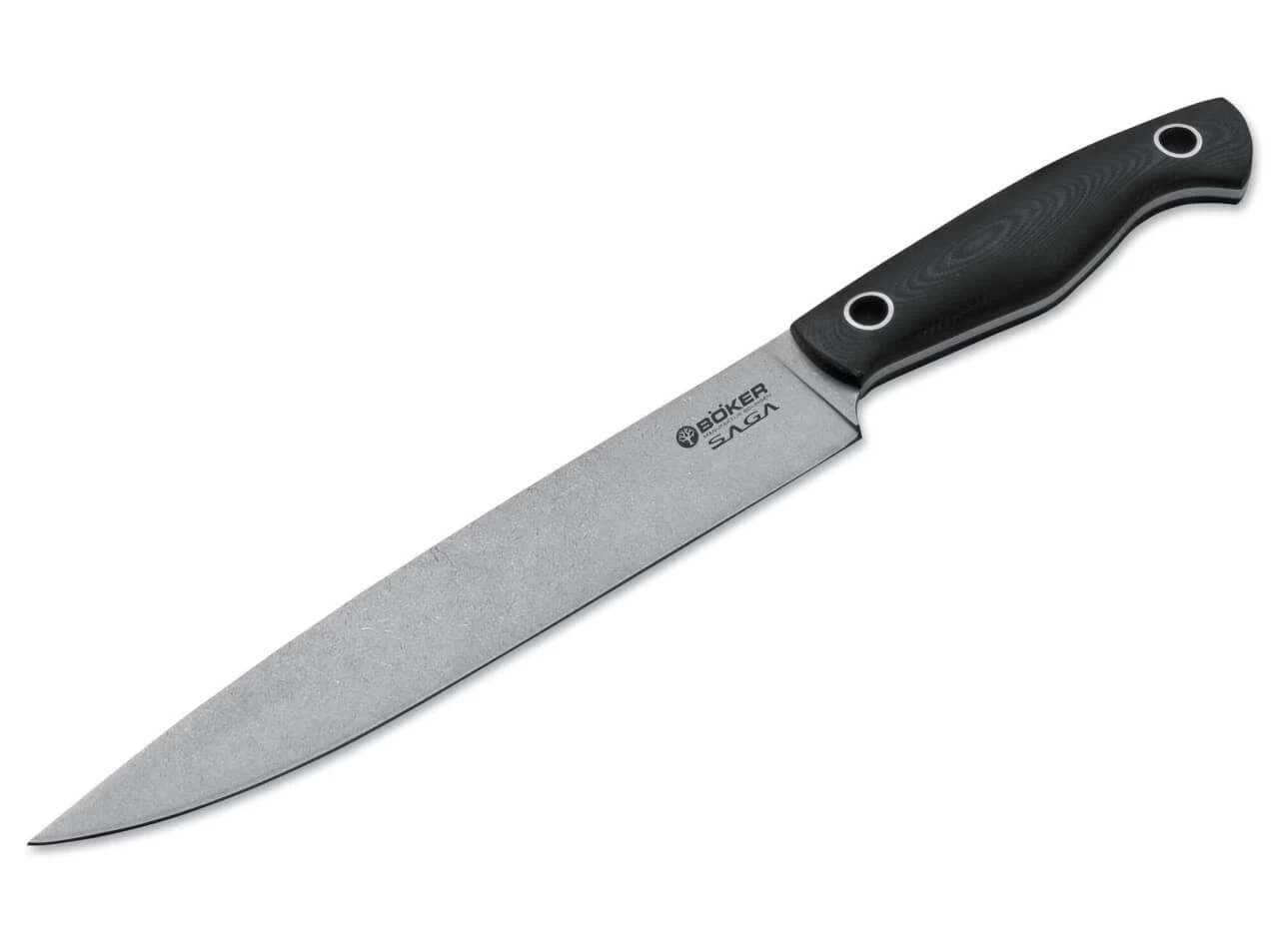 Die sanft geschwungenen Griffe werden aus unverwüstlichem schwarzen G10 gefertigt, das weder gegen Temperatur noch gegen Feuchtigkeit empfindlich ist. Schon bei der ersten Kontaktaufnahme mit der Messerserie Böker Saga wird die gelungene Ergonomie deutlich: Jeder Bogen, jeder Schwung in der Linie schmiegt sich an seine Stelle in der Hand und vermittelt eine absolute Kontrolle und ein überragendes Schneiderlebnis. Das schwalbenschwanzartig verbreiterte Griffende der größeren Modelle bringt zusätzliche Griffsicherheit. Die hohe Stabilität verdankt Böker Saga dem komplett durchgehenden Erl, der das Messer (in der gleichen Bauweise wie viele Jagdmesser) von der Klingenspitze bis zum Griffende durchzieht. Für eine optimale Schneidleistung steht nicht nur der komplette Flachschliff der Klinge mit Stonewash-Finish, sondern auch die Wahl von 440C als Klingenstahl, der hinsichtlich Schnitthaltigkeit und Korrosionsbeständigkeit übliche Küchenmesserstähle weit übertrifft. Dieses in einem speziellen Schleifverfahren erzeugte Oberflächenfinish zeichnet sich durch hervorragende Gleiteigenschaften im Schnittgut aus und fördert so die ohnehin ausgezeichnete Schneidleistung. Des weiteren ist die Mikrostruktur des Stonewash-Finish extrem unempfindlich gegen Kratzer, da diese sich optisch in der Struktur oft verlieren..Den besonderen Akzent setzen die großen Hohlnieten, die unverkennbar die Handschrift von Jesper Voxnæs tragen.