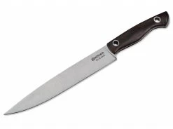 Die sanft geschwungenen Griffe werden aus exklusiv zertifiziert importiertem Grenadillholz gefertigt. Mit seiner hohen Härte und Dichte ist Grenadill u.a. fest etabliert im europäischen Holzblasinstrumentenbau. Schon bei der ersten Kontaktaufnahme mit der Messerserie Böker Saga wird die gelungene Ergonomie deutlich: Jeder Bogen, jeder Schwung in der Linie schmiegt sich an seine Stelle in der Hand und vermittelt eine absolute Kontrolle und ein überragendes Schneiderlebnis. Das schwalbenschwanzartig verbreiterte Griffende der größeren Modelle bringt zusätzliche Griffsicherheit. Die hohe Stabilität verdankt Böker Saga dem komplett durchgehenden Erl, der das Messer (in der gleichen Bauweise wie viele Jagdmesser) von der Klingenspitze bis zum Griffende durchzieht. Für eine optimale Schneidleistung steht nicht nur der komplette Flachschliff der Klinge mit Stonewash-Finish, sondern auch die Wahl von 440C als Klingenstahl, der hinsichtlich Schnitthaltigkeit und Korrosionsbeständigkeit übliche Küchenmesserstähle weit übertrifft. Dieses in einem speziellen Schleifverfahren erzeugte Oberflächenfinish zeichnet sich durch hervorragende Gleiteigenschaften im Schnittgut aus und fördert so die ohnehin ausgezeichnete Schneidleistung. Des weiteren ist die Mikrostruktur des Stonewash-Finish extrem unempfindlich gegen Kratzer, da diese sich optisch in der Struktur oft verlieren..Den besonderen Akzent setzen die großen Hohlnieten, die unverkennbar die Handschrift von Jesper Voxnæs tragen.