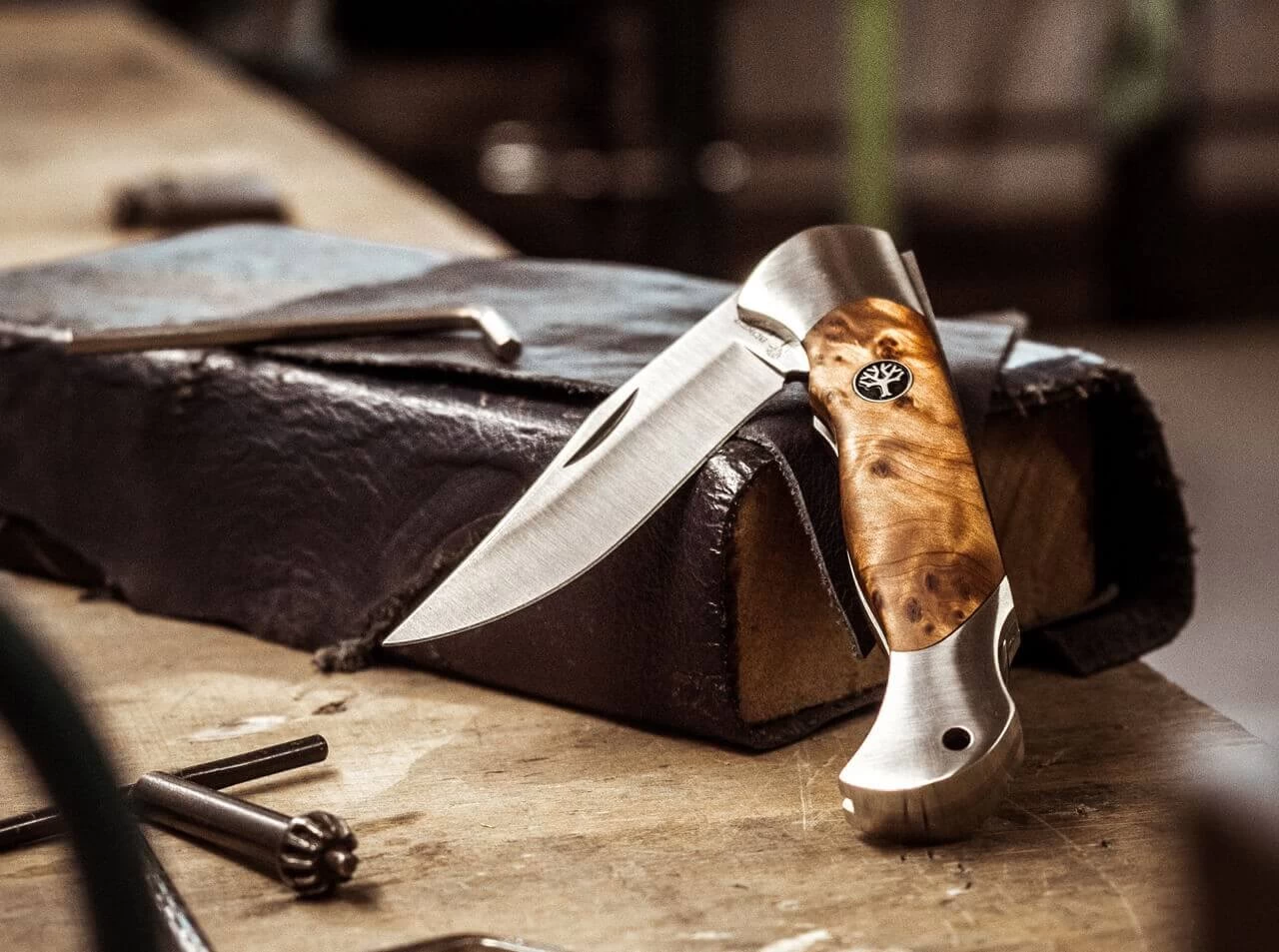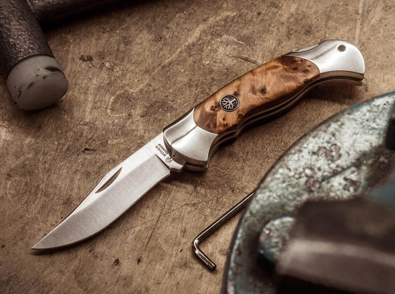 Die im Innern des Griffes verborgene Mechanik besteht aus einer Bolzenwippe und einer Feder. Bei ausgeklappter Klinge greift die Bolzenwippe in eine Aussparung der Klinge und arretiert sie dadurch. Das hintere Ende der Bolzenwippe wird nicht vollständig vom Griff verdeckt, sondern liegt am Griffrücken zum Teil frei, damit sie betätigt werden kann. Wird nun das freiliegende hintere Ende der Bolzenwippe gedrückt, hebt sich der Haken aus der Kerbe, sodass sich die Arretierung löst und die Klinge eingeklappt werden kann. Die angenehm geformten Griffschalen aus warmen zertifiziert importiertem Thujaholz runden das harmonische Bild des Klassikers ab.