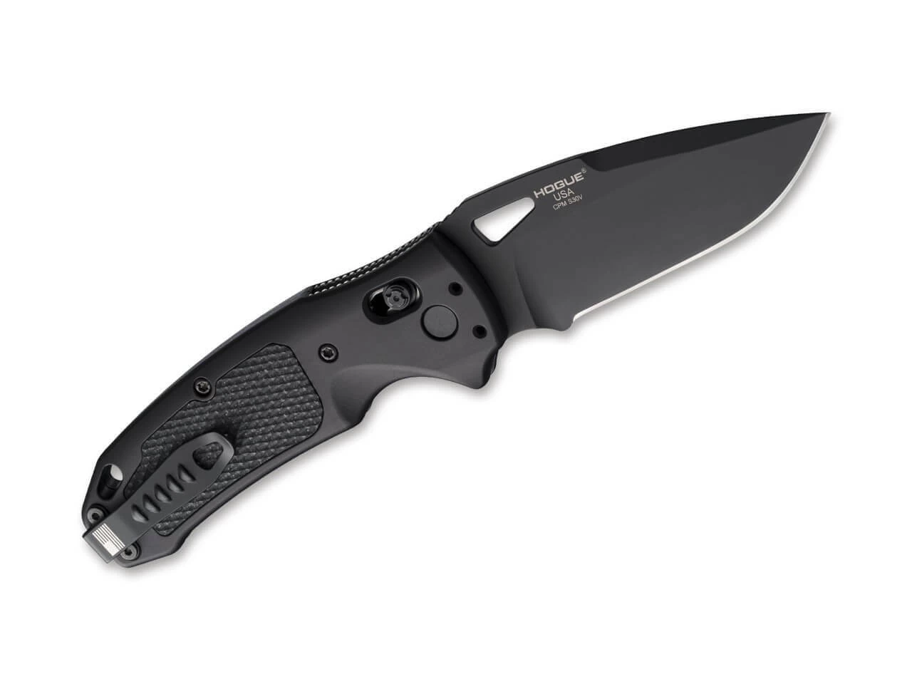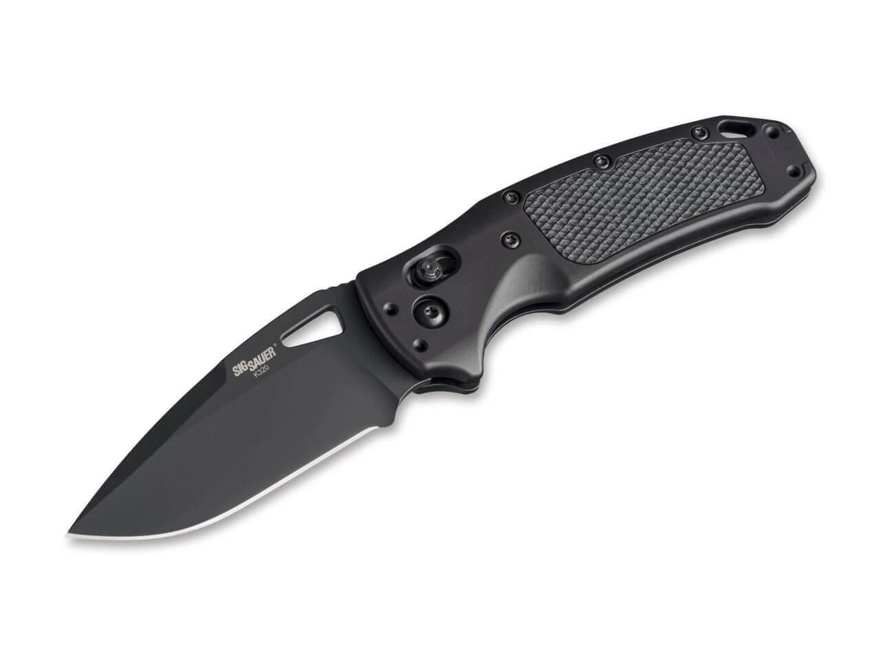 In Zusammenarbeit mit dem US-amerikanischen Messerspezialisten Hogue präsentiert SIG das K320 AXG Pro als taktisches Einsatzmesser in einem komplett schwarzen Gewand. Die Drop Point Klinge aus pulvermetallurgischem CPM-S-30V ist mit einer Fehlschärfe versehen und wird per Daumenöffnung in Betrieb genommen. Zur Sicherung der Klinge kommt der robuste ABLE Lock zum Einsatz, der diese durch ein Zurückschieben des seitlichen Knopfes wieder löst. Herausragende Haptik bietet der ergonomische Aluminiumgriff, der mit rutschfesten Einlagen aus G10 versehen ist. Mit Fangriemenöse und vierfach umsetzbarem Clip.