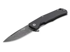 Das Messer des Jahres 2015 auf der Blade Show, das T.R.E, punktet mit seinem überaus gelungenen Modularkonzept. Der abnehmbare Flipper, die abnehmbare Daumenscheibe und die damit verbundenen Umrüstmöglichkeit von Einhand- auf Zweihandbedienung ermöglichen es, das Messer den jeweiligen individuellen Wünschen und Vorlieben anzupassen. Der von Hand geschmiedete rostfreie Damast von Chad Nichols aus Mississippi im Muster “Raindrop” bietet mit seiner feinen Zeichnung einen ausgewogenen optischen Gegenpart zur Kohlefaser der Vorderschale. Auch hier trägt die rückwärtige Titanschale einen aus dem Vollen gefrästen Titanclip. Diese unvergleichliche Materialkombination begeistert nicht nur die Freunde solcher High-Tech-Materialien, sondern gewährleistet auch Alltagstauglichkeit ohne Kompromisse. Lieferung in edler Holzverpackung und mit Werkzeug zum Wechseln der Öffner.