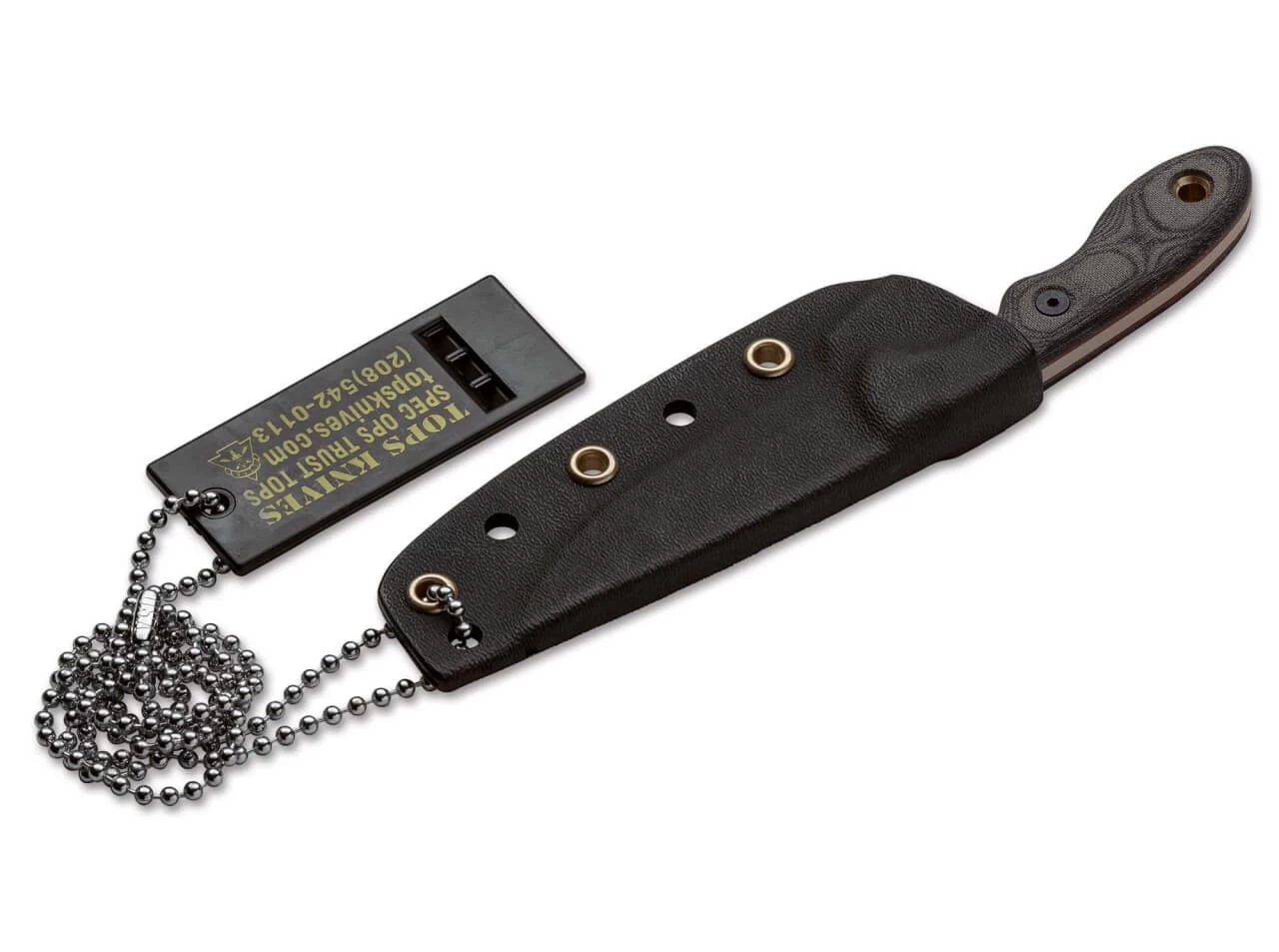 Das Mini Scandi Neck Knife ist eines der populärsten Modelle von TOPS überhaupt. Genau am Übergang von Neck Knife zu Gürtelmesser konzipiert, macht das Mini Scandi bei beiden Trageweisen eine gute Figur! Als Ableger des erfolgreichen Brothers of Bushcraft Messers geht das Mini Scandi auf die Klingenformen aus dem skandinavischen Bereich zurück, speziell auf die Messer der Samen. In seiner verkleinerten Form bietet das Mini Scandi trotz seiner kompakten Abmaße und des hohen Tragekomforts hohe Vielseitigkeit und Praxistauglichkeit. Das MSK Survival bietet schwarze Canvas- Micartaschalen mit roten Fiberlagen, für sicheren Griff auch bei Nässe und Kälte. Pulverbeschichtung in Coyote Tan. Modifizierter Scandi-Schliff. 1095 Kohlenstoffstahl. Lieferung mit Kydexscheide mit Kugelkette.