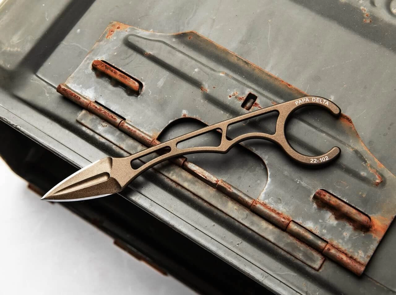 Das TOPS Papa Delta wurde von Leo Espinoza in Zusammenarbeit mit einem pensionierten Polizei- und Geheimdienstmitarbeiter entwickelt. Als taktisches Neck Knife kommt es vor allem auf eine diskrete Trageweise an. Aus diesem Grund ist es dünn, skelettiert und in jeder Hinsicht unauffällig. Das “unvollständige” Fingerloch ist absichtlich nicht verschlossen, damit das Messer leichter losgelassen werden kann als bei einem normalen Karambit mit geschlossenem Ring. Die beidseitig abgezogene Klinge aus 1095 ist von einem Bronze Cerakote-Finish überzogen und verleiht dem feststehenden Messer eine besondere Anmutung. Dank der mitgelieferten Kydex Scheide lässt sich das Papa Delta ideal um den Hals tragen.