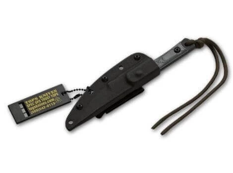 Design by requirements – Design nach Anforderungen, das ist das Credo der bekannten Messerschmiede TOPS aus Idaho im Herzen der Rocky Mountains. Das Unternehmen verfügt über ein extrem hohes Maß an behördlichem Input, da viele TOPS Mitarbeiter auf eine lange polizeiliche oder militärische Karriere zurückblicken können und bestens mit den Behörden vernetzt sind. Jedes Modell wird, bevor es in Serie geht, mindestens 6 Monate lang im Feldeinsatz getestet. Die äußerst stabilen Messerklingen werden vorwiegend aus dem vielfach bewährten 1095 Kohlenstoff-stahl gefertigt und mit einer speziellen, abriebfesten Pulverbeschichtung (eigens für TOPS entwickelt) vor Korrosion geschützt. Dieses sog. Traction Coating hat den besonders anspruchsvollen Salznebeltest des US Militärs 7 Tage lang unbeschadet überstanden. Aufgrund der Robustheit und Zuverlässigkeit werden TOPS Messer von den Alliierten Streitkräfte in den aktuellen Krisengebieten als wichtiger Ausrüstungsbestandteil besonders geschätzt. Alle Modelle bei TOPS sind Made in the USA! Seit mehr als 10 Jahren wird dieses einfache, aber dennoch starke und effiziente Messer von den verschiedensten Nutzergruppen geschätzt. Die Kompaktheit und Stabilität dieses bewährten Entwurfes sind mittlerweile legendär. Die 1095er Kohlenstoffstahlklinge, gepaart mit den Micartagriffschalen mit weißen Fiberlagen, ergibt ein Maximum an Zuverlässigkeit. Mit Kydexscheide mit Gürtelclip, Fangriemen und Signalpfeife.