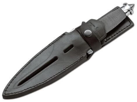 United Cutlery ist weltweit der führende Anbieter von Film- und Fantasy-Messern bzw. Schwertern. Böker war der erste Anbieter, der Produkte von United Cutlery bereits in den 80er Jahren in Europa exklusiv und erfolgreich angeboten hat. Wir freuen uns nun, nach erfolgter Reorganisation von United Cutlery, Ihnen Neuauflagen alter Bestseller und beeindruckende Neuentwicklungen vorstellen zu dürfen. Das Modell Double Shadow ist ein Klassiker von Gil Hibben. Der Double Shadow ist ein schwerer, unkonventioneller Dolch. Die Klinge besteht aus zwei einschneidigen Klingen, die in ihrer Gesamtheit einen zweischneidigen Dolch ergeben. Die rostfreie Klinge aus 420 Edelstahl ist edel matt satiniert. Der Griff ist ebenfalls mit silbernem Draht umwickelt. Inkl. hochwertiger Lederscheide mit Gürtelclip.