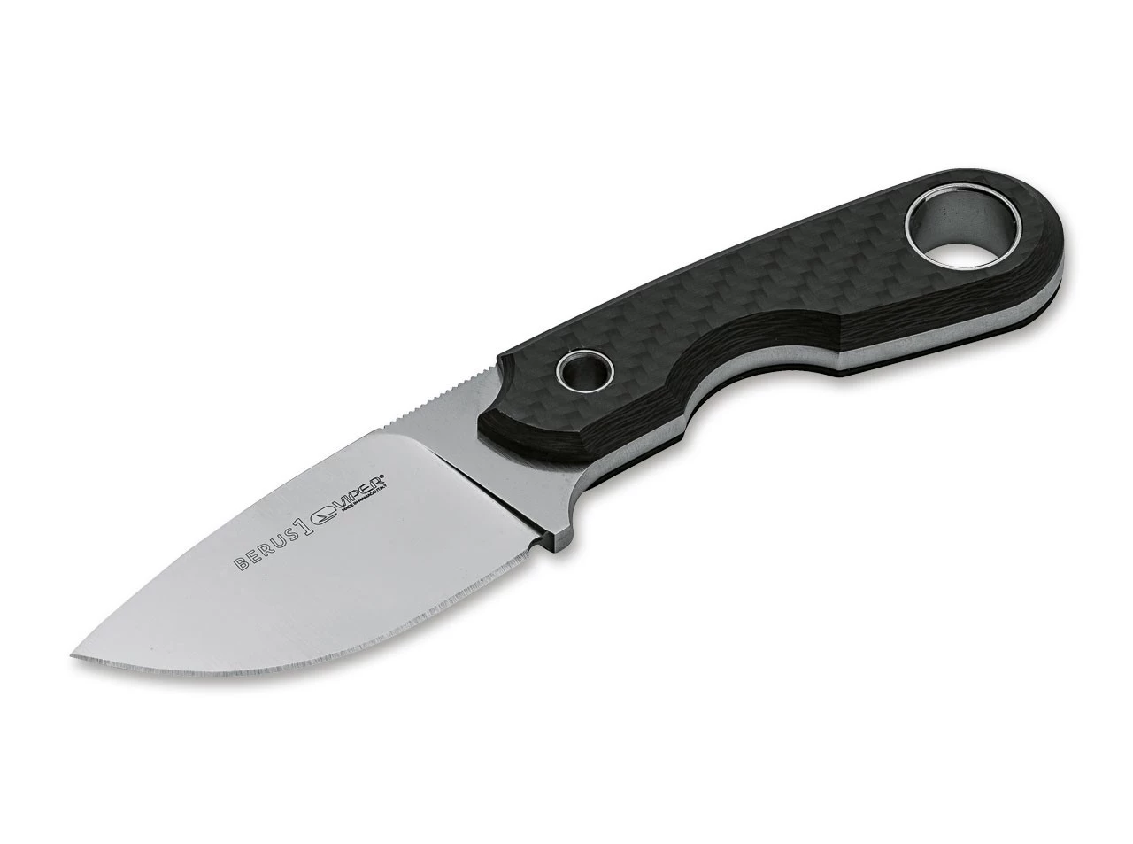 Mit dem Viper Berus 1 hat Tommaso Rumici ein effizientes Droppoint Messer aus dem Hut gezaubert, welches die Charakteristika der namensgebenden Kreuzotter (Vipera Berus) perfekt verkörpert. Die bissige Klinge aus M390 Stahl schneidet wie durch Butter und der schlanke Griff aus Kohlefaser ist ein wahrer Handschmeichler. Durch die große Fangriemenöse des feststehenden Messers lassen sich auch stärkere Lanyards elegant durchschlängeln. Das Viper Berus 1 wird mit einer praktischen Kydexscheide geliefert.