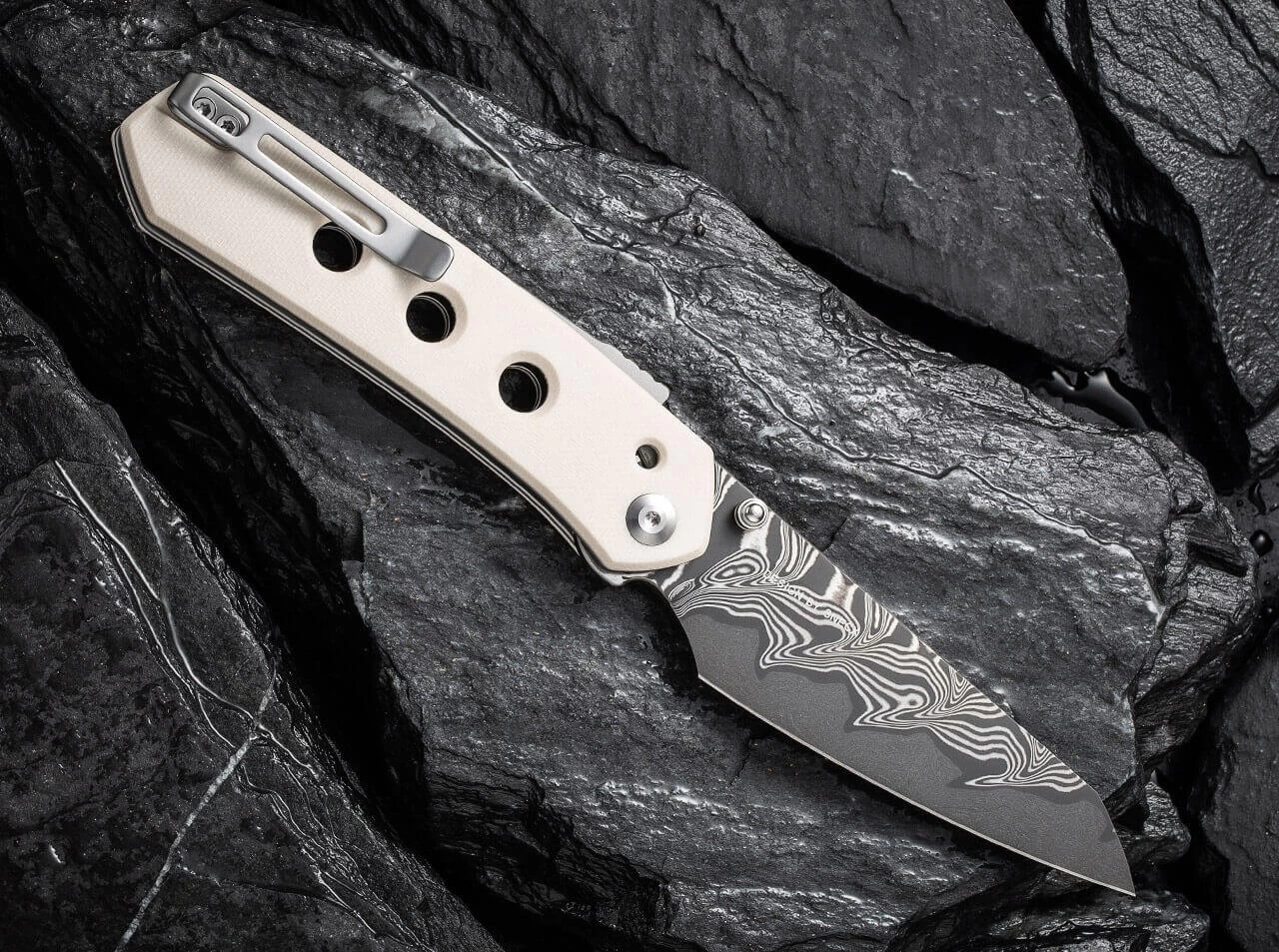 Das Vision FG entstand aus einer visionären Idee von CIVIVI und Snecx Tan heraus, die nun stahlgewordene Realität geworden ist. Das avantgardistische EDC-Messer ist mit einer kugelgelagerten Reverse Tanto Klinge aus edlem Damast ausgestattet, die über hervorragende Schneidfähigkeiten verfügt. Neben den gewichtsreduzierenden Löchern im cremeweißen G10 Griff setzt der beidseitige Daumenpin die Erscheinung des futuristischen Messers stimmig fort. Gesichert wird die Klinge durch den Superlock Mechanismus, der beim Zurückziehen des Hebels am Klingenrücken das Messer wieder entriegelt. Mit Tip-Up Clip (r).