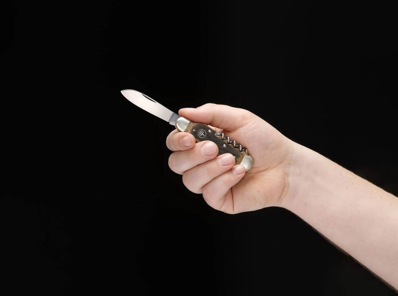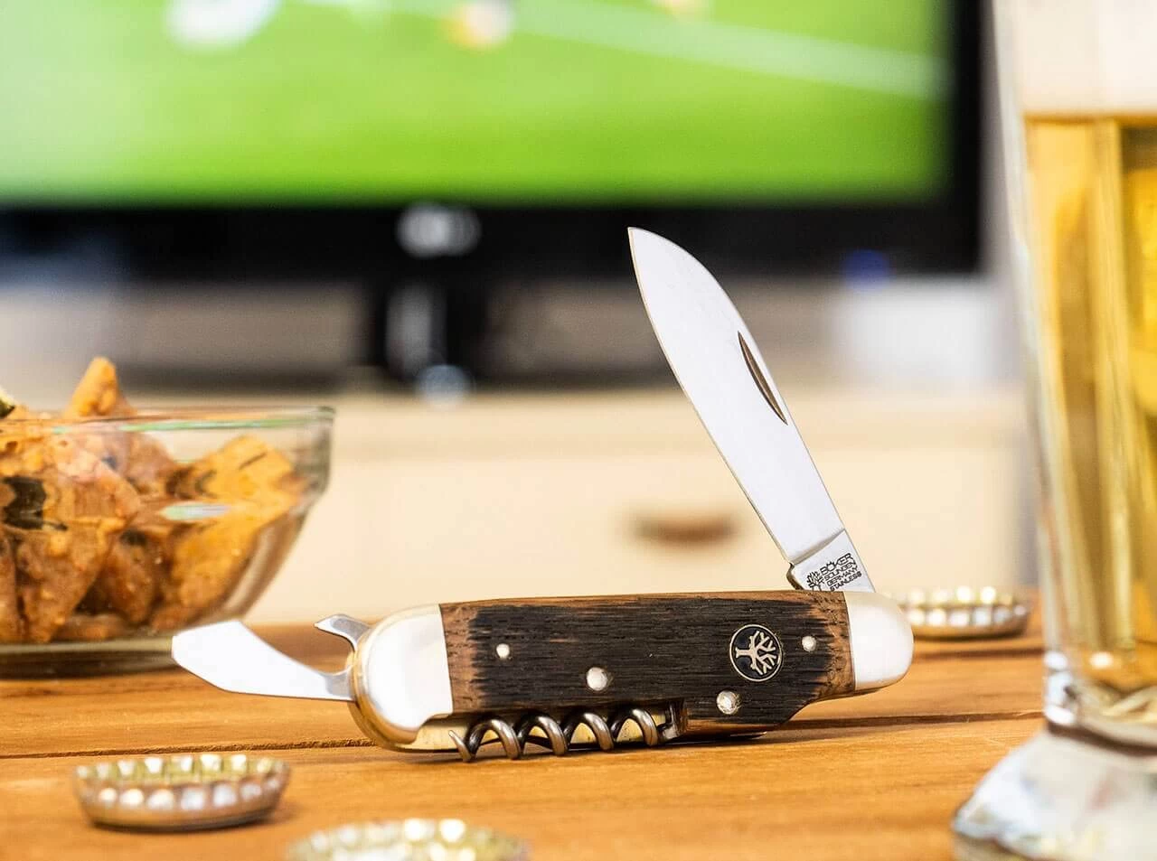 Das dreiteilige Böker Winzermesser verfügt über eine Klinge, einen Kapselheber und natürlich über einen Korkenzieher. So ist der Besitzer für alle eventuell eintretenden Erfrischungsfälle gewappnet. Die Beschalung greift den Gedanken auf und besteht aus dem heimischen Eichenholz alter Rotweinfässer. Das traditionelle Design ist vollkommen westentaschentauglich und bietet klare praktische Vorteile. Für das Ausfahren der Instrumente braucht man immer zwei Hände, die Klingen sind nicht feststellbar. Stattdessen halten die klassischen Stützfedern das Messer geöffnet. Die Klinge wird aus 4034er Stahl gefertigt, dem klassischen Solinger Klingenstahl, der Korrosionsresistenz, Schnitthaltigkeit und leichte Nachschärfbarkeit miteinander verbindet. Handgefertigt in der Böker Messer-Manufaktur Solingen.