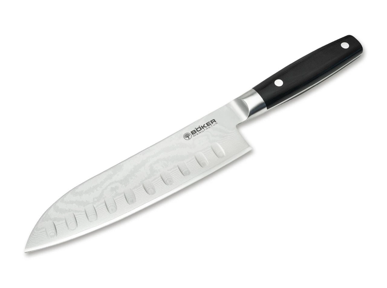 Die außergewöhnliche Kochmesser-Serie Böker Yadama Premium verbindet klassische Formgebung mit eindrucksvollen Damastklingen und wird so zu einem wahren Blickfang in jeder Küche. Die dank Vollerl-Bauweise überaus stabilen Messer sind optimal ausbalanciert und liegen angenehm in der Hand. Ergonomisch geformte Griffschalen aus rutschfestem Micarta werden klassisch mit zwei Edelstahlnieten dauerhaft und ohne Fugen mit dem vollständig durchgehenden Messererl verbunden. Die Gestaltung der Klingen samt Übergang zum Kropf erlauben ein problemloses Nachschärfen und gewährleisten in Kombination mit der richtigen Pflege eine langfristig perfekte Funktion der Messer.